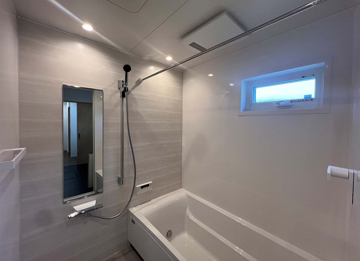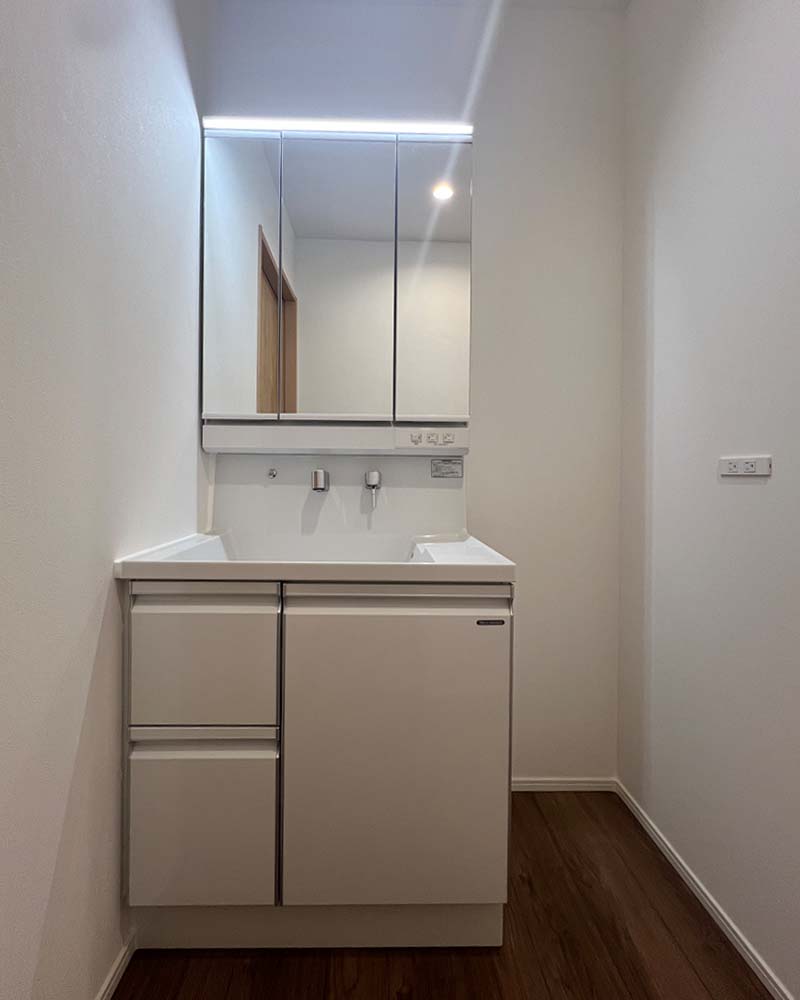 シンプルな中に機能美が光る洗面化粧台。日々の暮らしを心地よく支える、清潔感のあるスペースです。