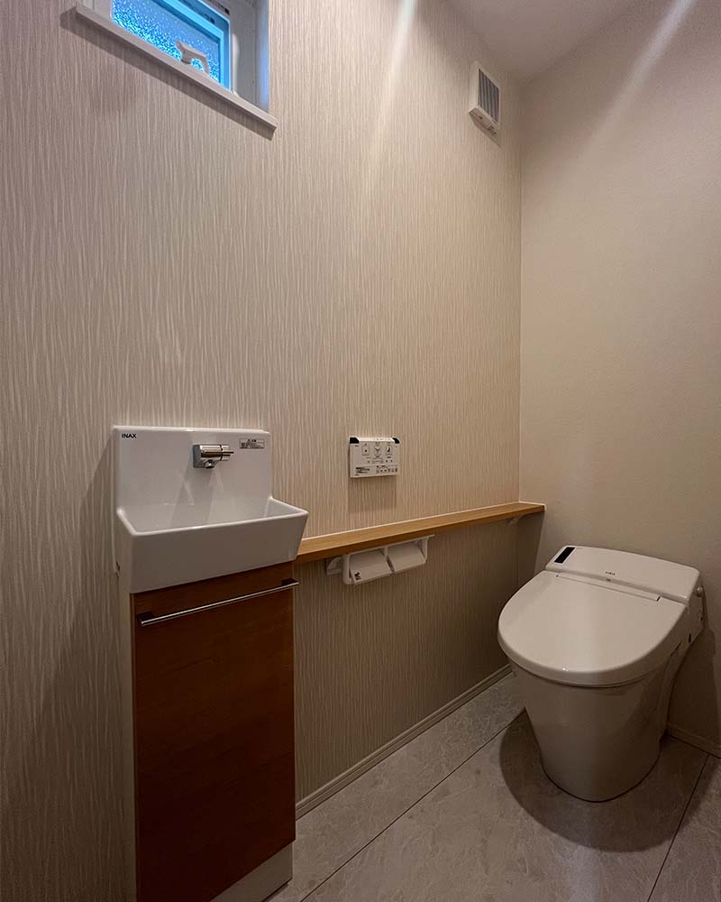 手洗い付きで使い勝手の良い設計。限られた空間の中にも、快適さと落ち着きを感じる空間です。