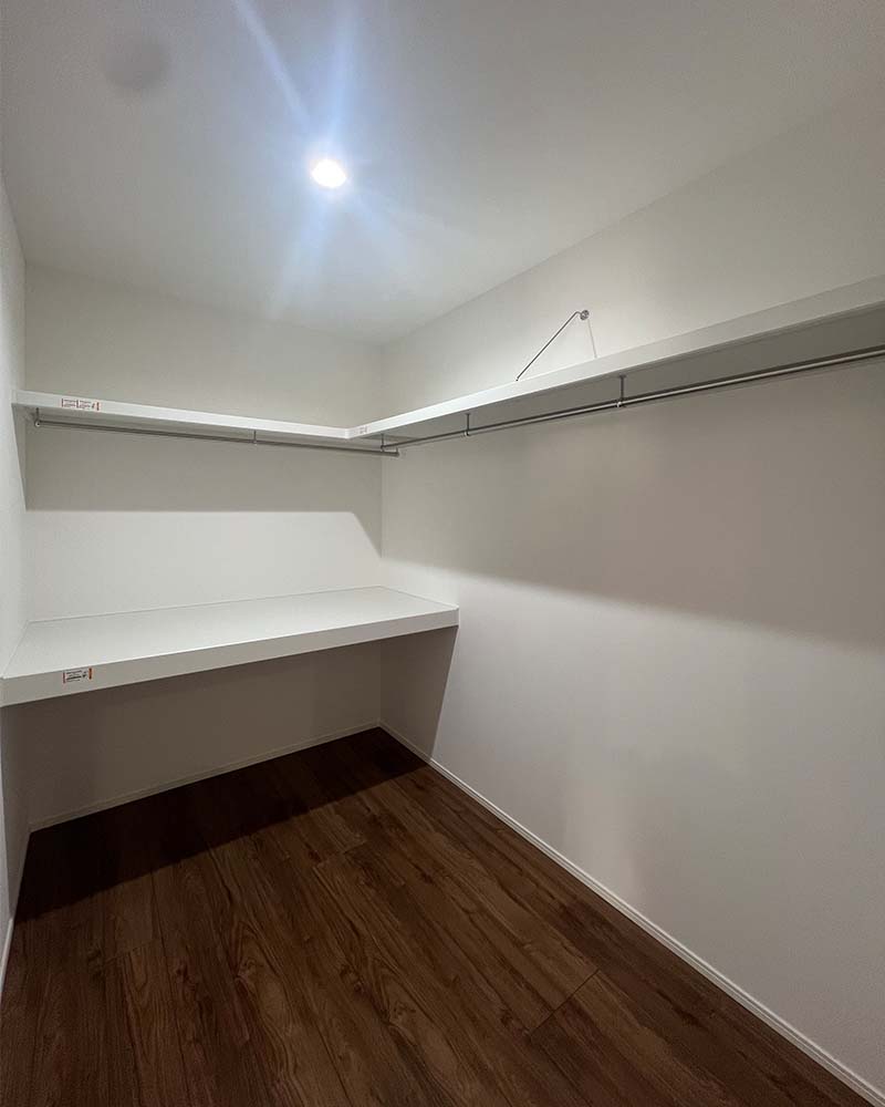 衣類や小物をすっきり収納できるウォークインクローゼット。見やすく取り出しやすい配置で、毎日の身支度がスムーズに。