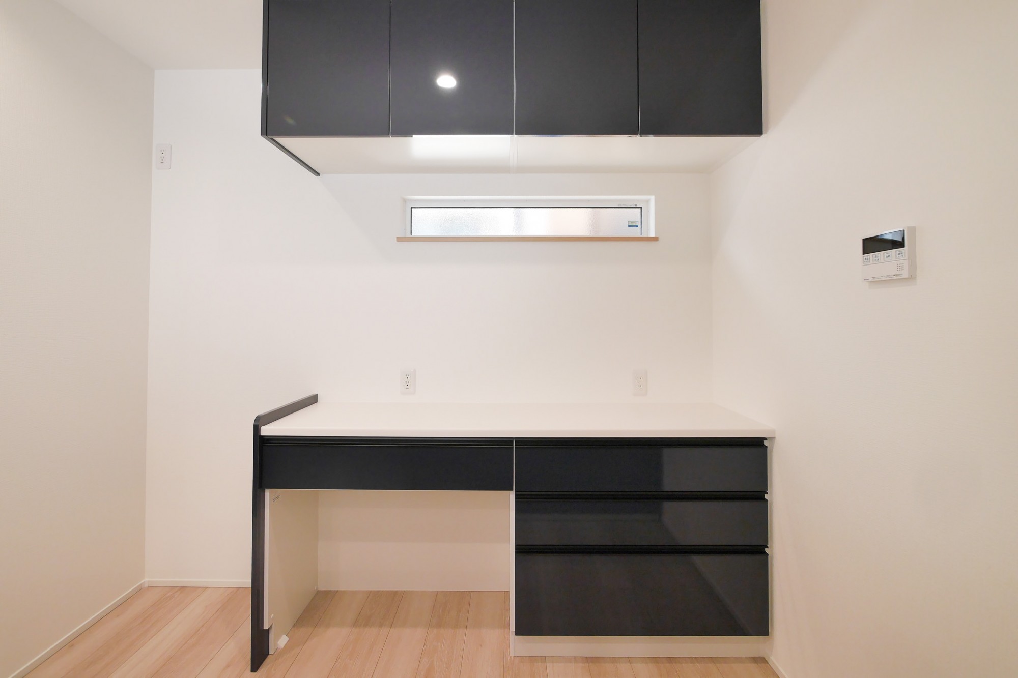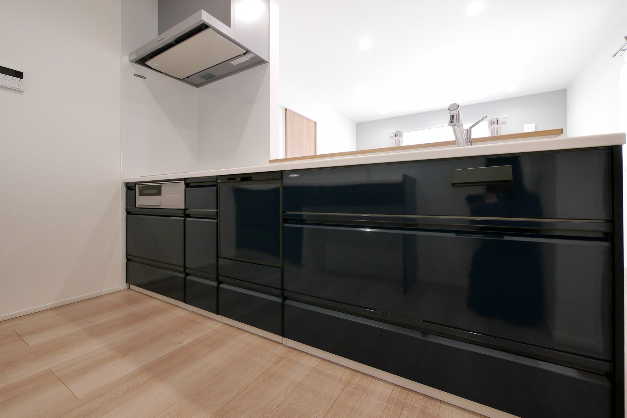 キッチンと色味を合わせた、統一感のあるカップボード。