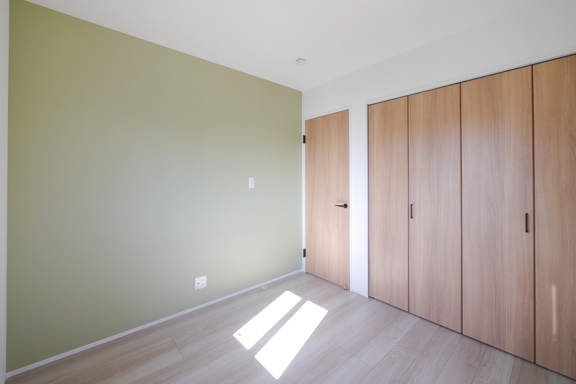 アースカラーのアクセントクロスが印象的な洋室。
