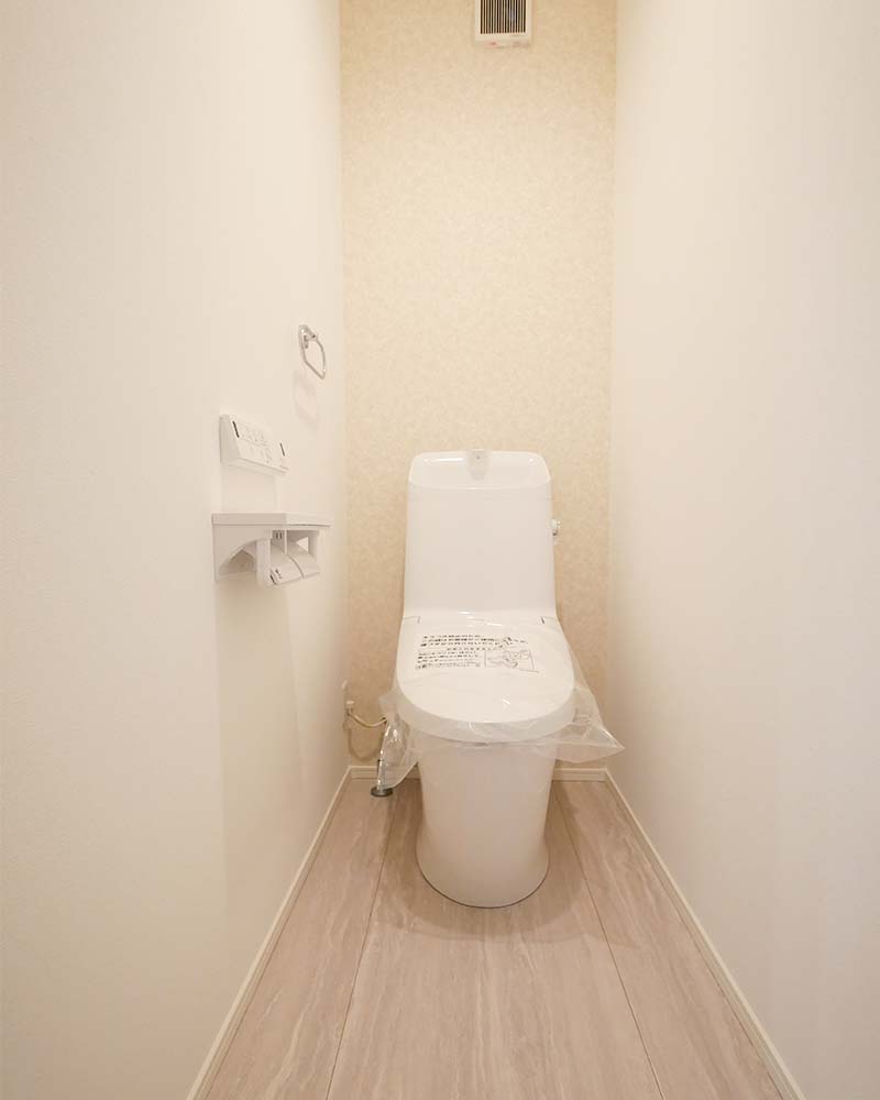コンパクトながらも圧迫感のない、心地よいトイレスペース。シンプルなデザインで、毎日快適に使える清潔感のある仕上がりです。