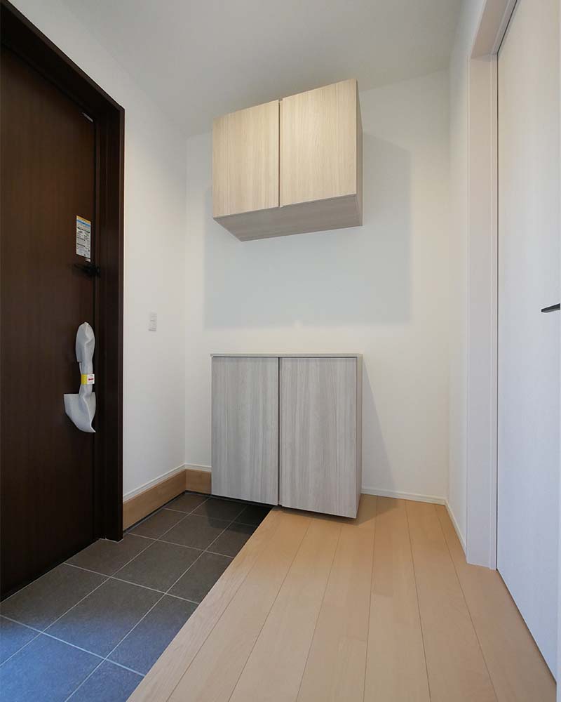 明るい木目の収納がやさしい雰囲気をつくる、すっきりとした玄関。靴や小物をまとめて収納でき、いつでも気持ちよく迎え入れられる空間です。