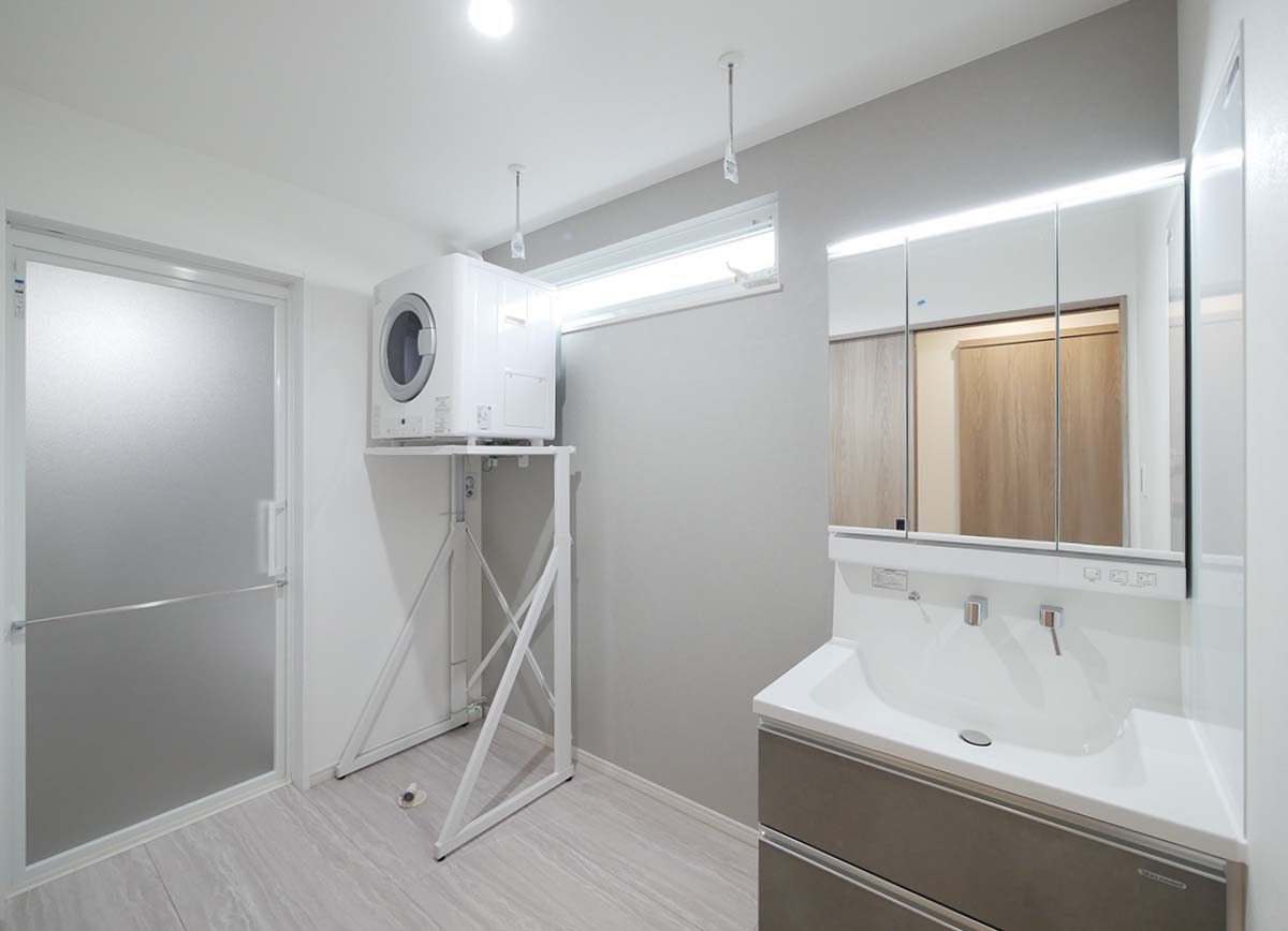 広々としたボウルと三面鏡で、毎日の身支度が快適に。シンプルで清潔感のあるデザインが、空間を明るく整えてくれます。