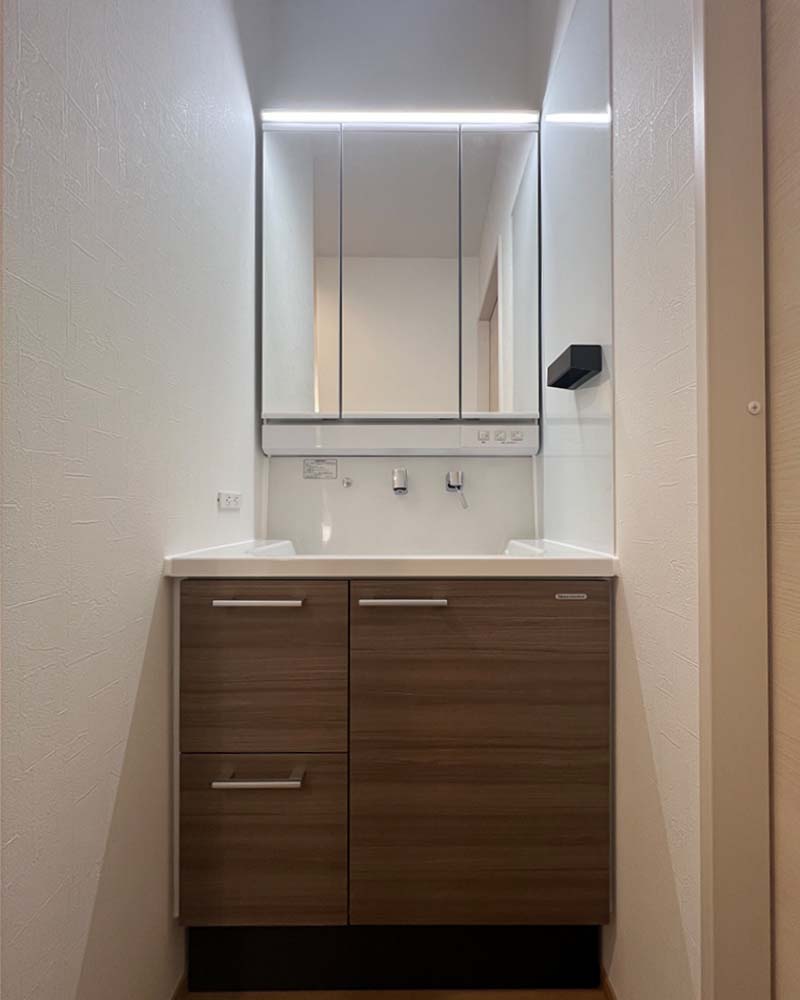 スタイリッシュな三面鏡と収納力のあるキャビネット。シンプルなデザインが、清潔感あふれる洗面スペースを演出します。