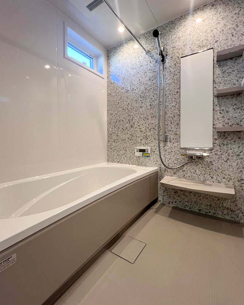 落ち着いたアクセントパネルが上質さを感じさせるバスルーム。ゆったり浸かれる浴槽で、1日の疲れを心地よく癒せます。