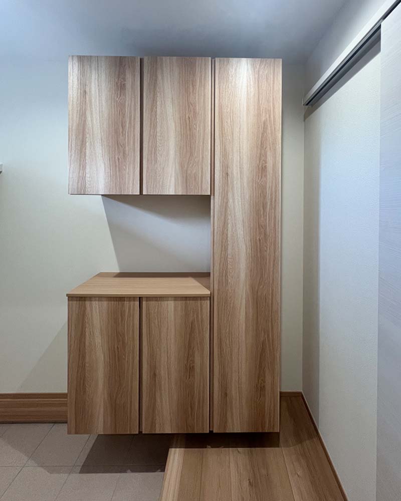 木目が美しい収納力たっぷりのシューズボックス。玄関をすっきり保ちながら、あたたかみのある印象をつくります。