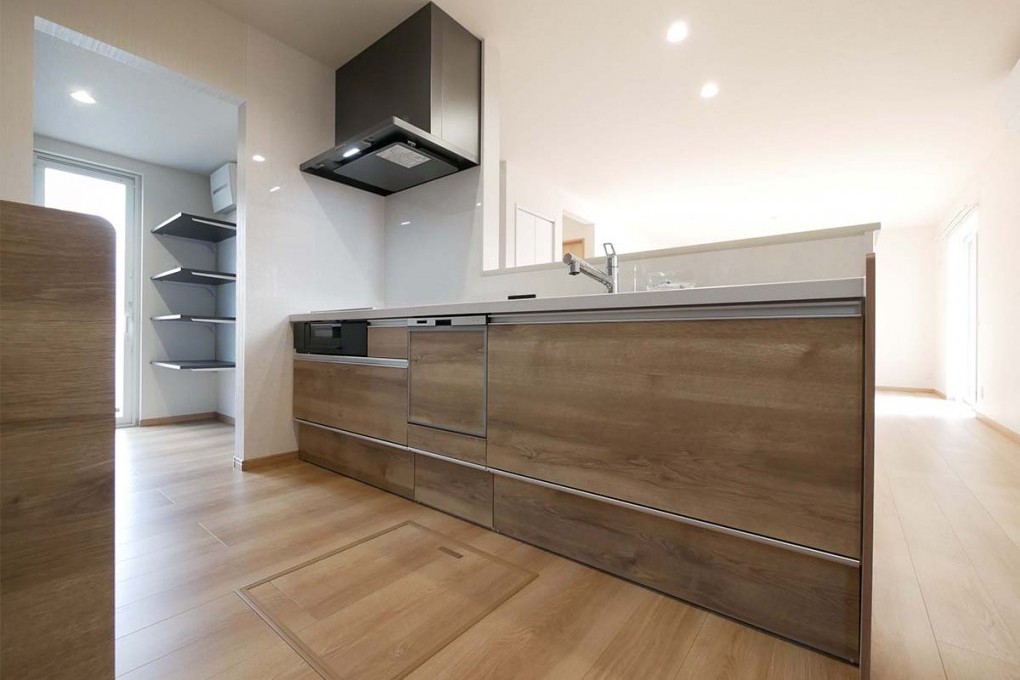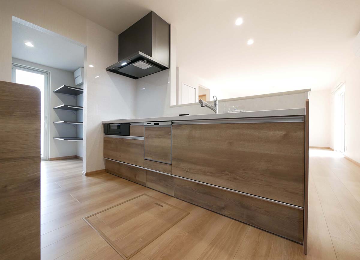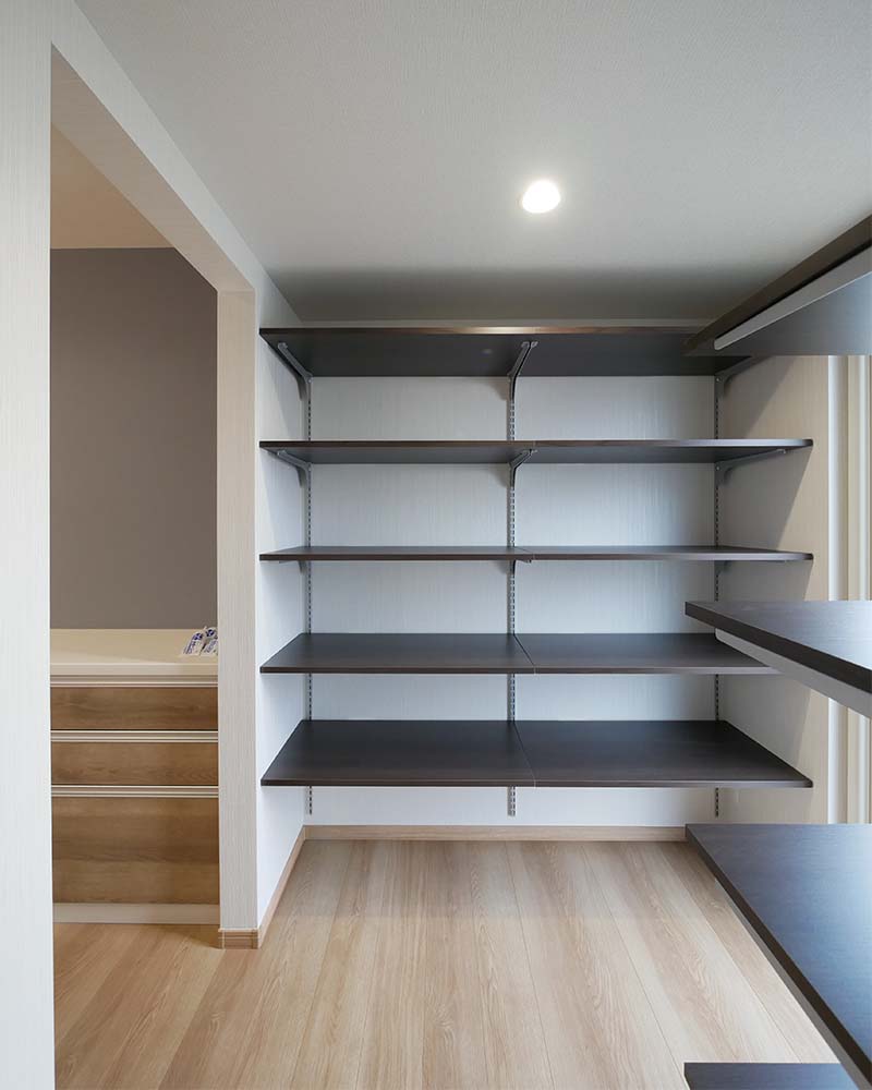 可動式の棚で高さ調整が自由にできる、大容量のパントリー。食品や日用品を“見える収納”でまとめられ、キッチンまわりがぐっと快適に。
