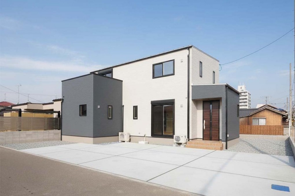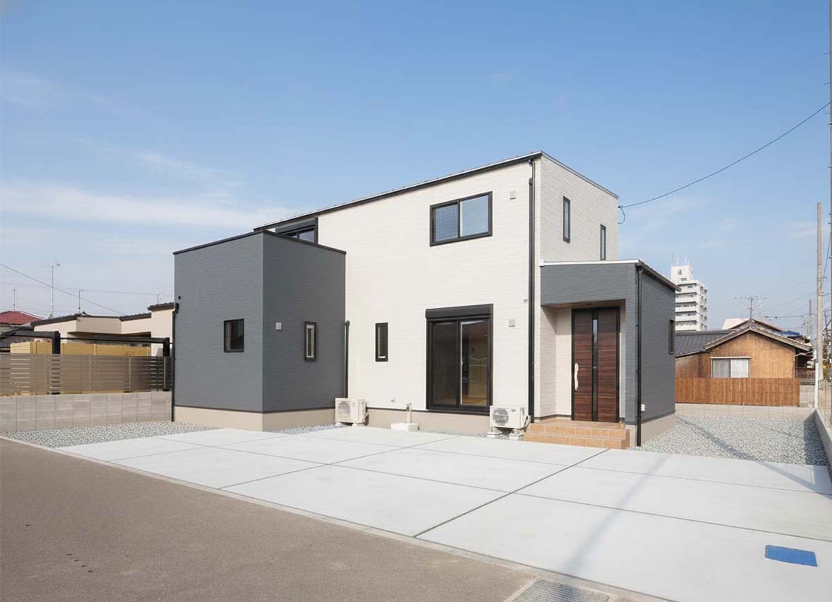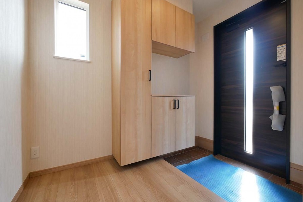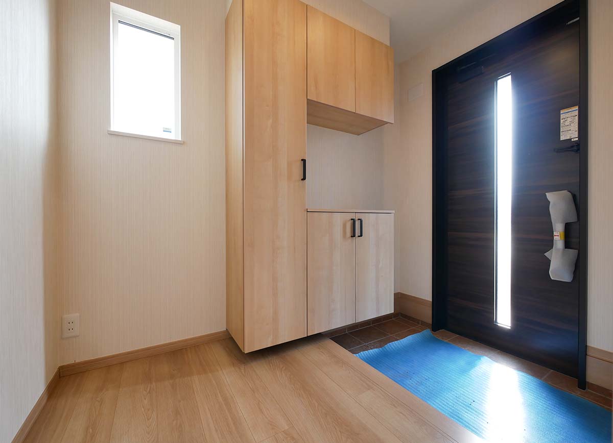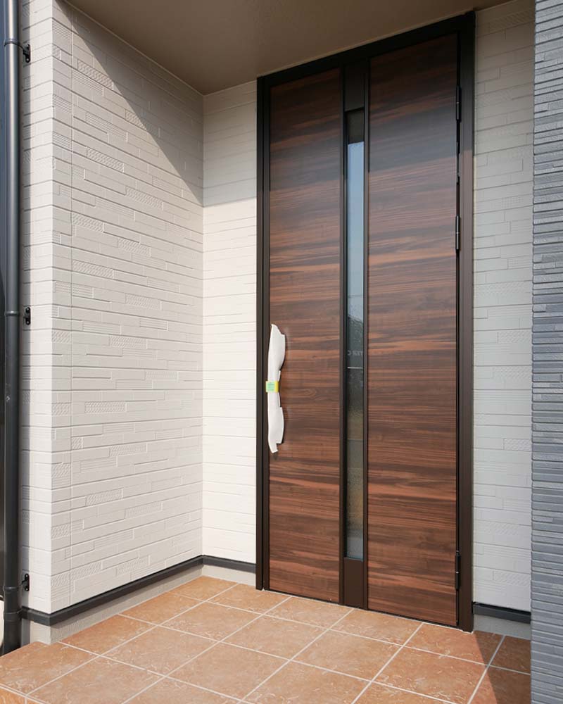 木目が美しい玄関ドアが、住まいの顔として上質な存在感を演出。タイル貼りのアプローチと調和し、訪れる人を温かく迎え入れます。