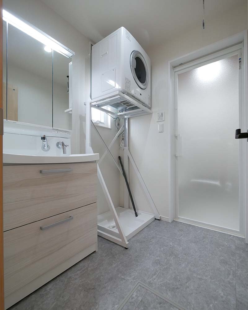 洗面台と乾燥機がコンパクトにまとまった、家事がしやすい脱衣室。“洗う・乾かす”がここで完結し、毎日の家事効率がぐんとアップします。