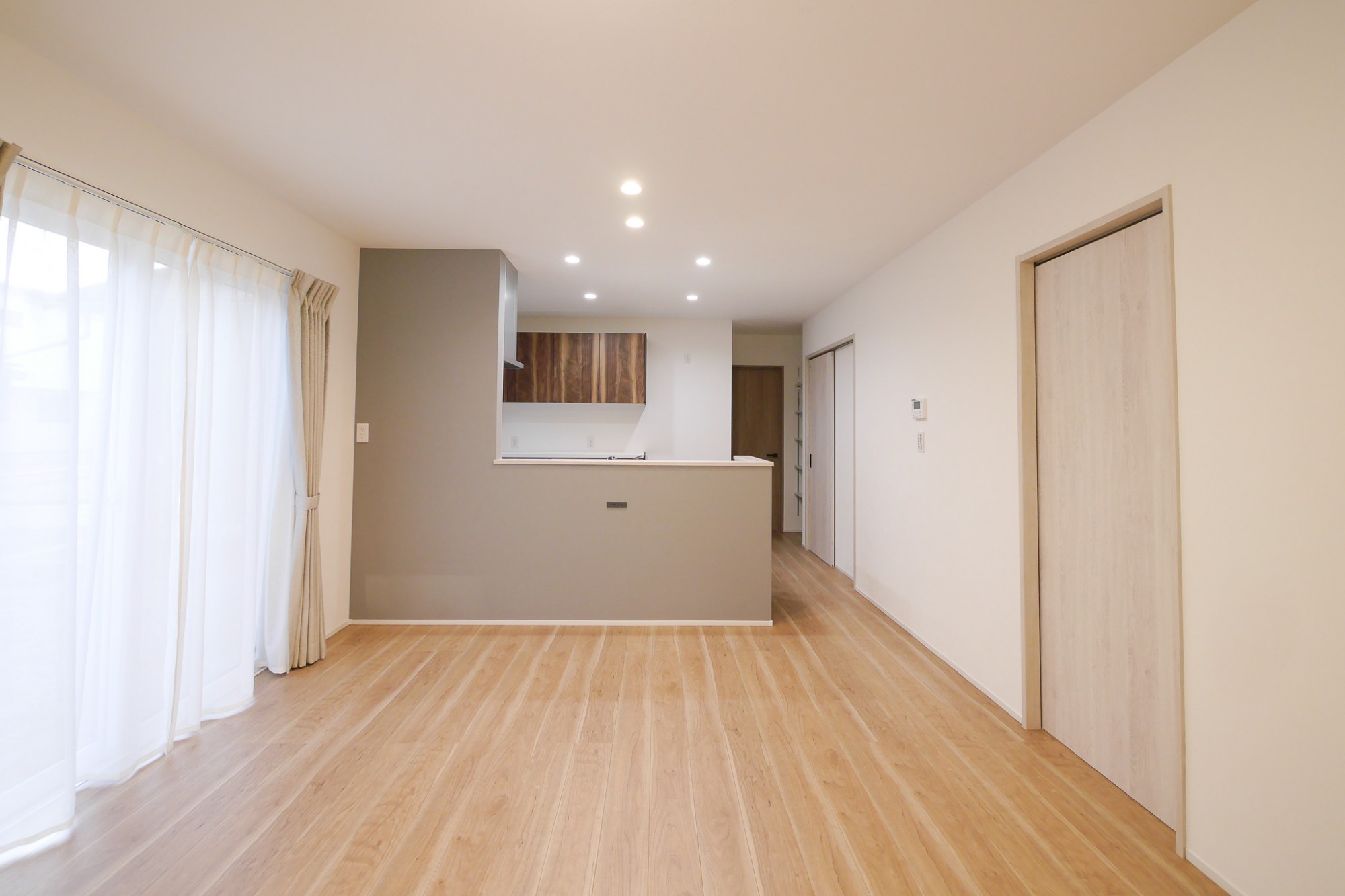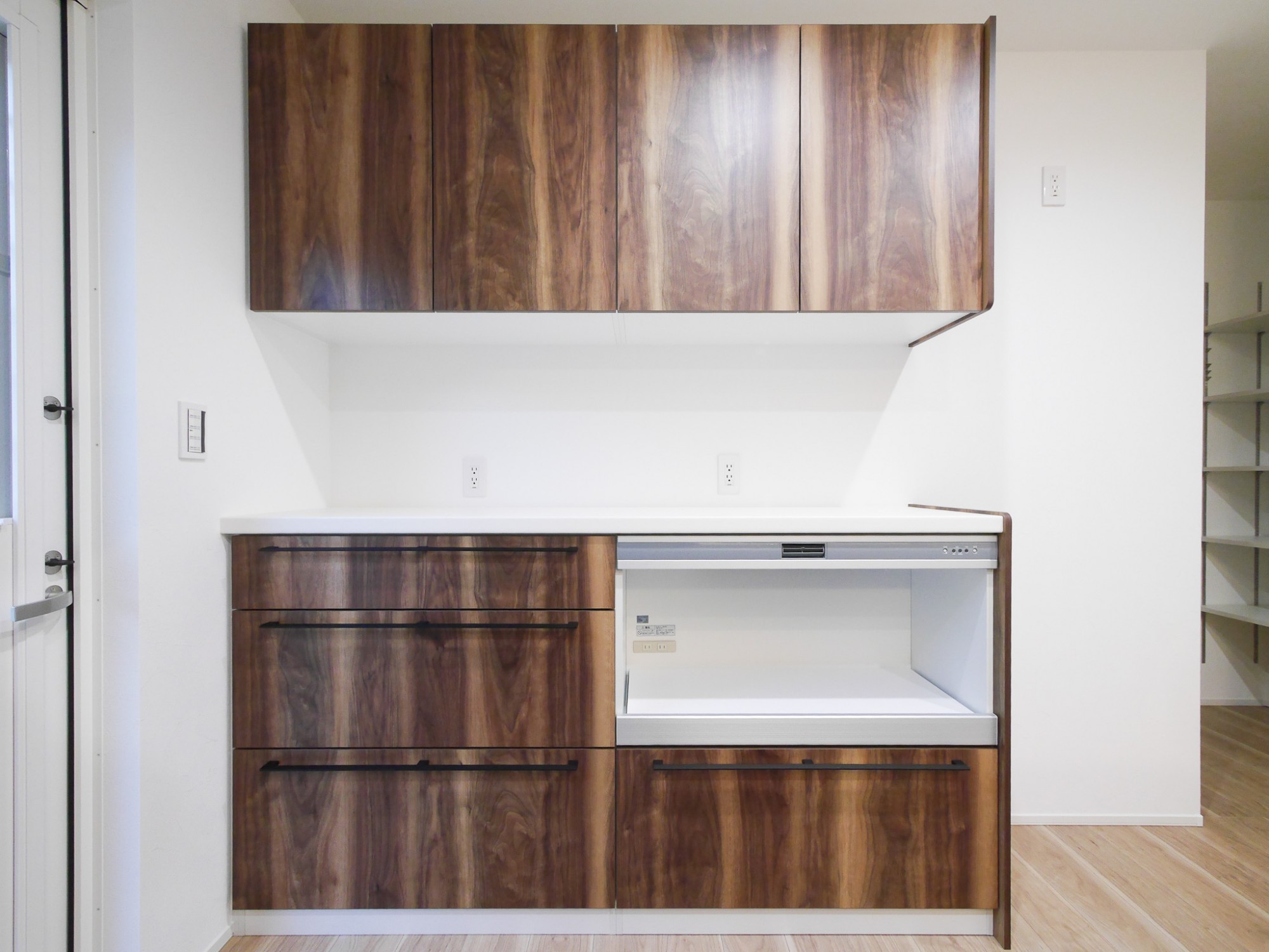 温かみのある木目調で、LDKの雰囲気に調和するカップボード。