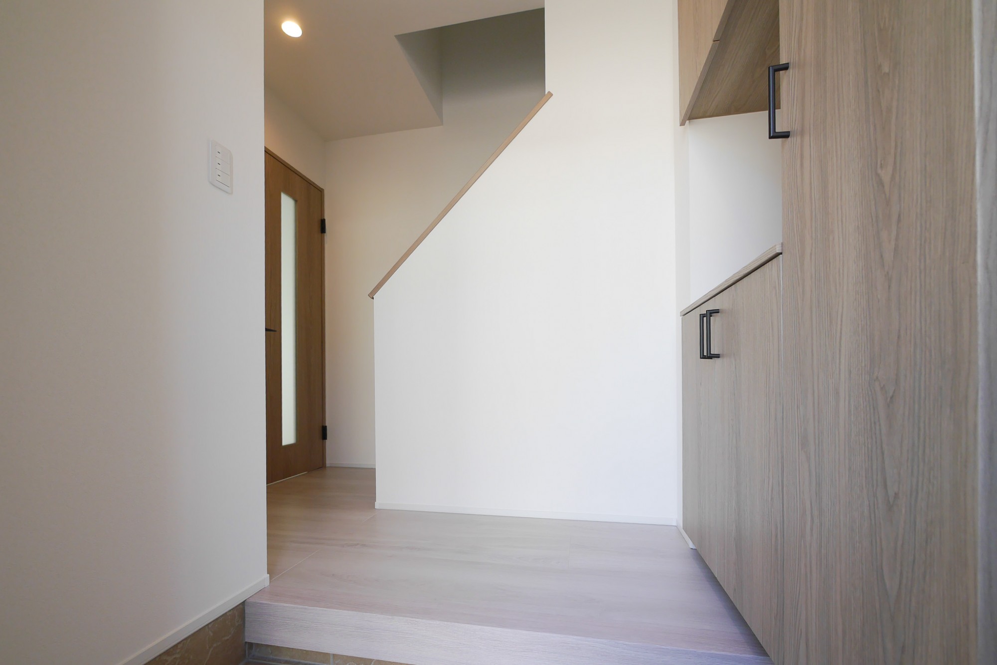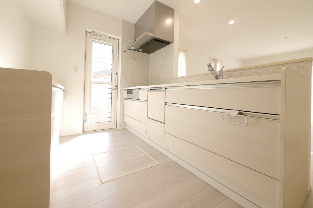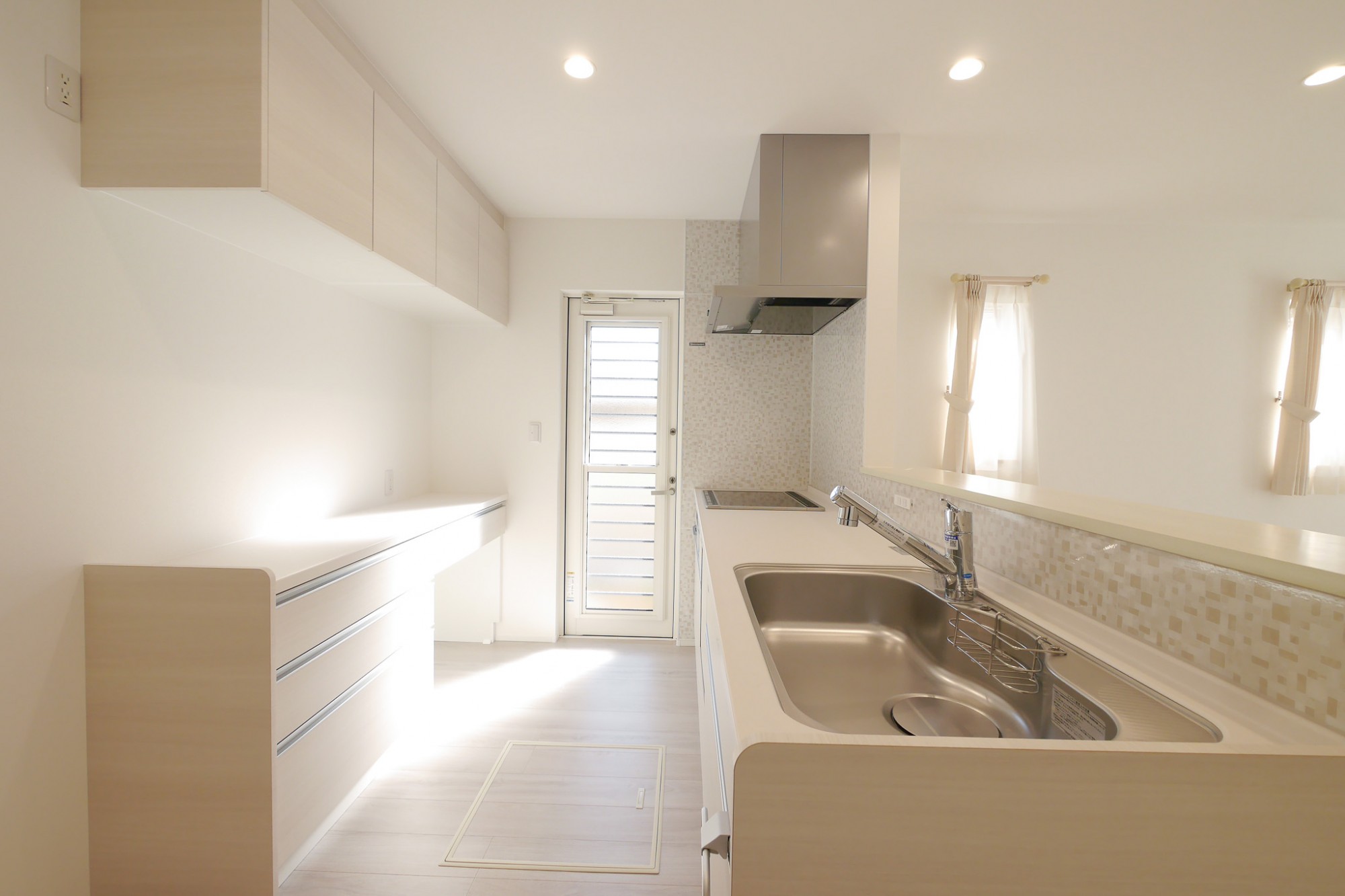 キッチンとデザインを統一した大容量のカップボードで、収納力と美しさを両立。