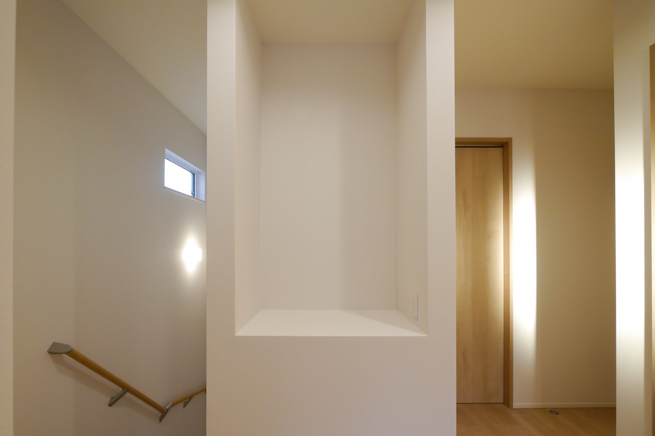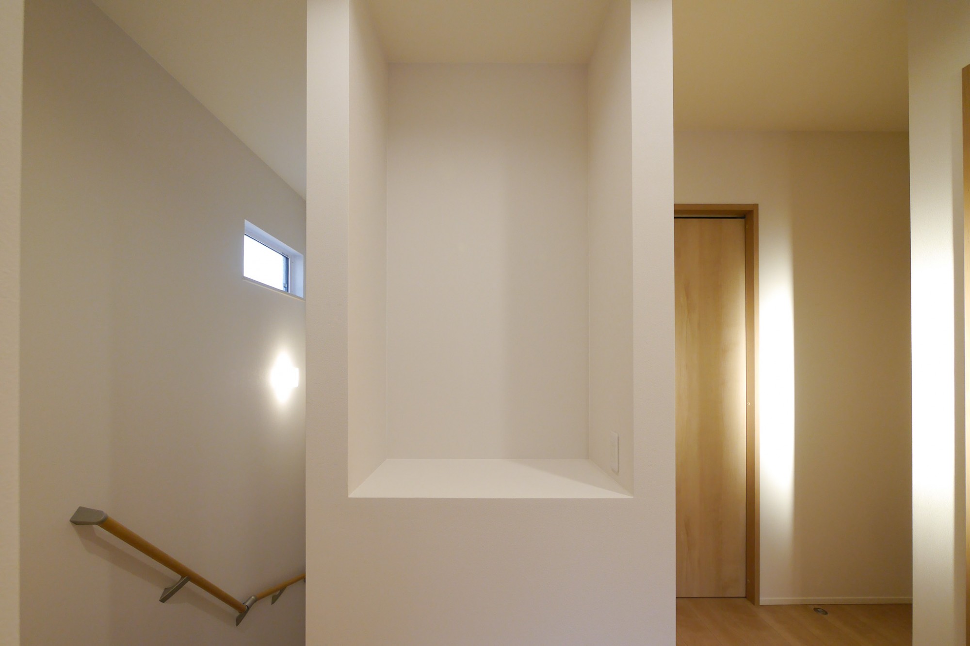 2階ホールの一角に設けられた、暮らしに彩りを添える飾り棚。