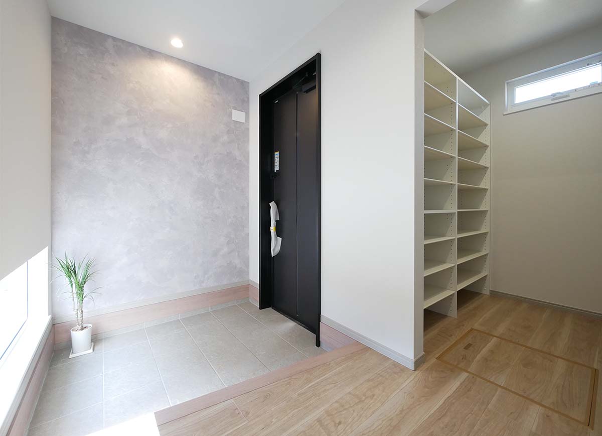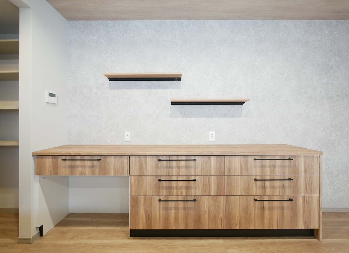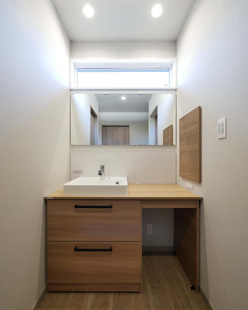 造作洗面台が映える、すっきりとした洗面スペース。身支度も家事も快適にこなせる、使いやすさに配慮した設計です。