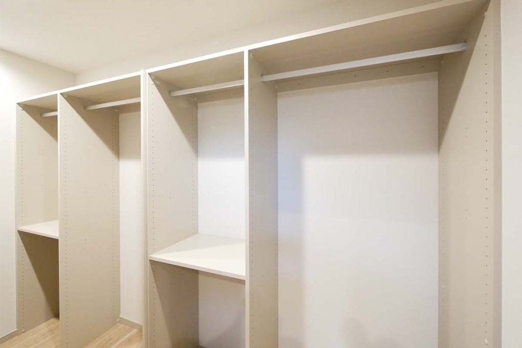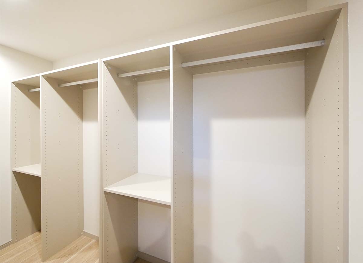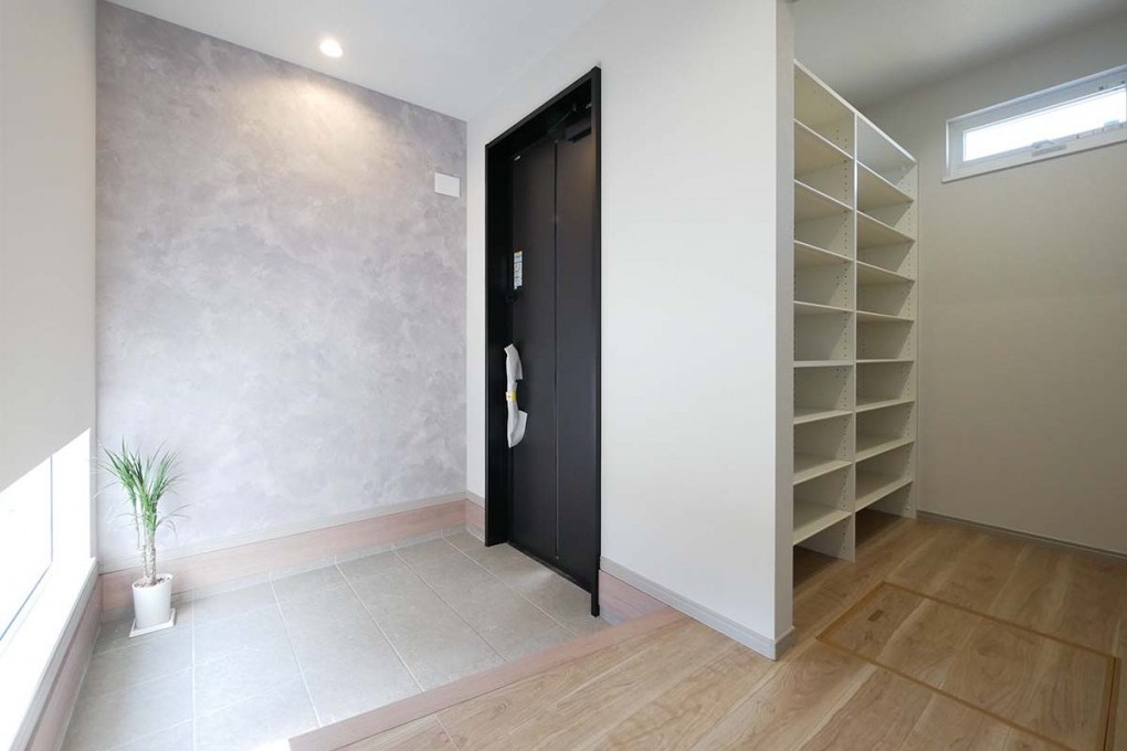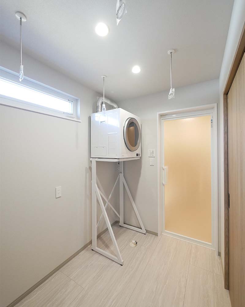 ガス衣類乾燥機を備えた、家事効率の高い脱衣室。天候に左右されず、洗濯から乾燥までをスムーズにこなせます。