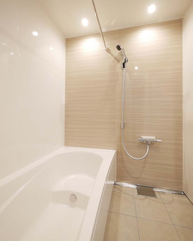 木目調パネルがやさしく包み込む、落ち着きのある浴室。一日の疲れをゆっくり癒す、心地よいバスタイムを演出します。