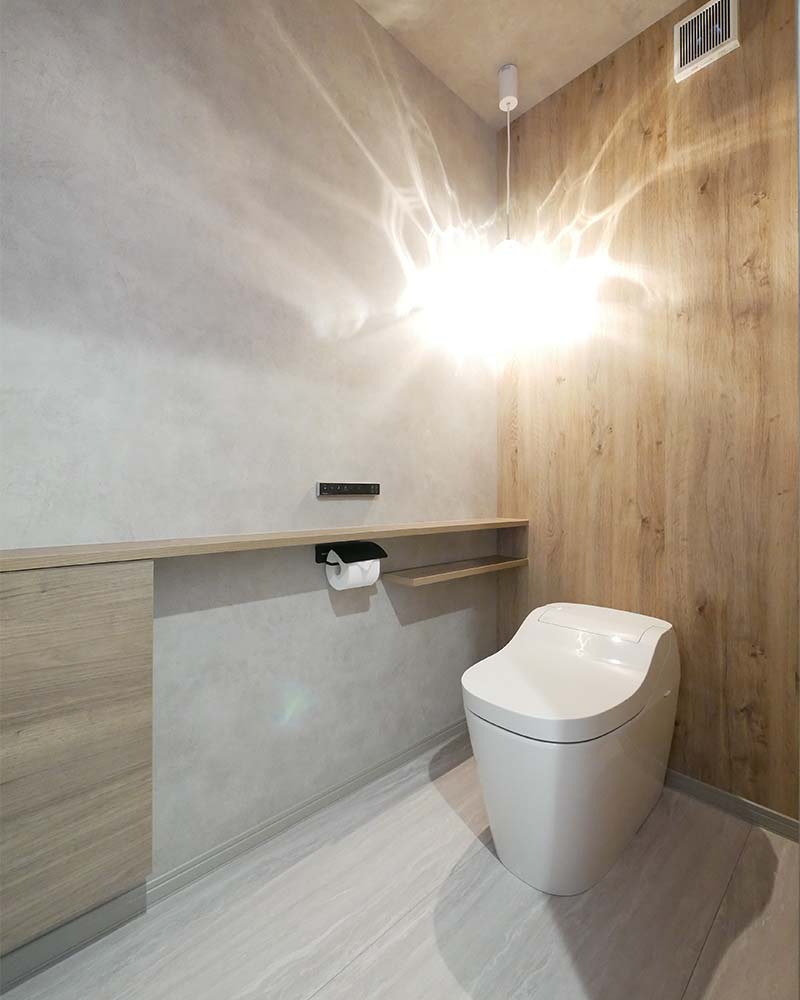 シンプルながらも素材感にこだわった、ホテルライクなトイレ。使うたびに心が整う、居心地のよい空間です。