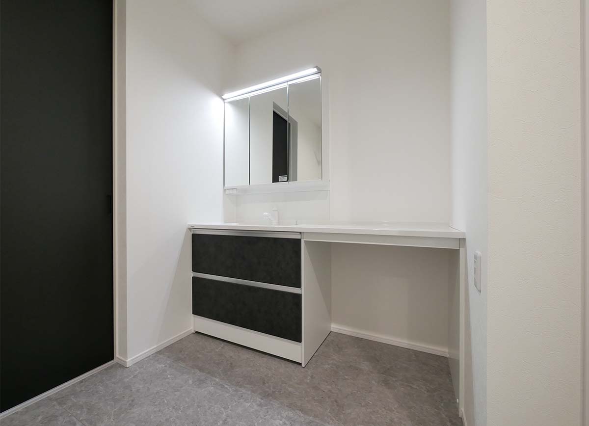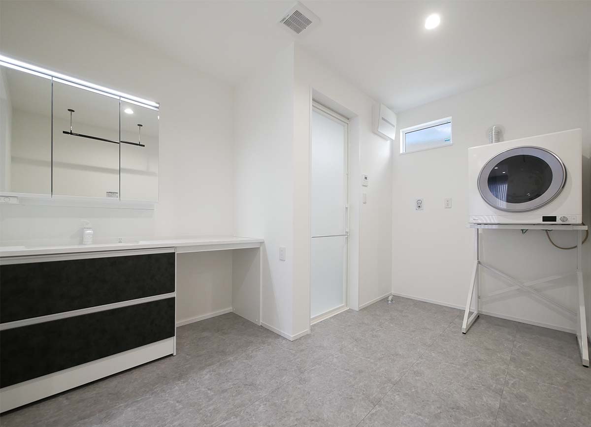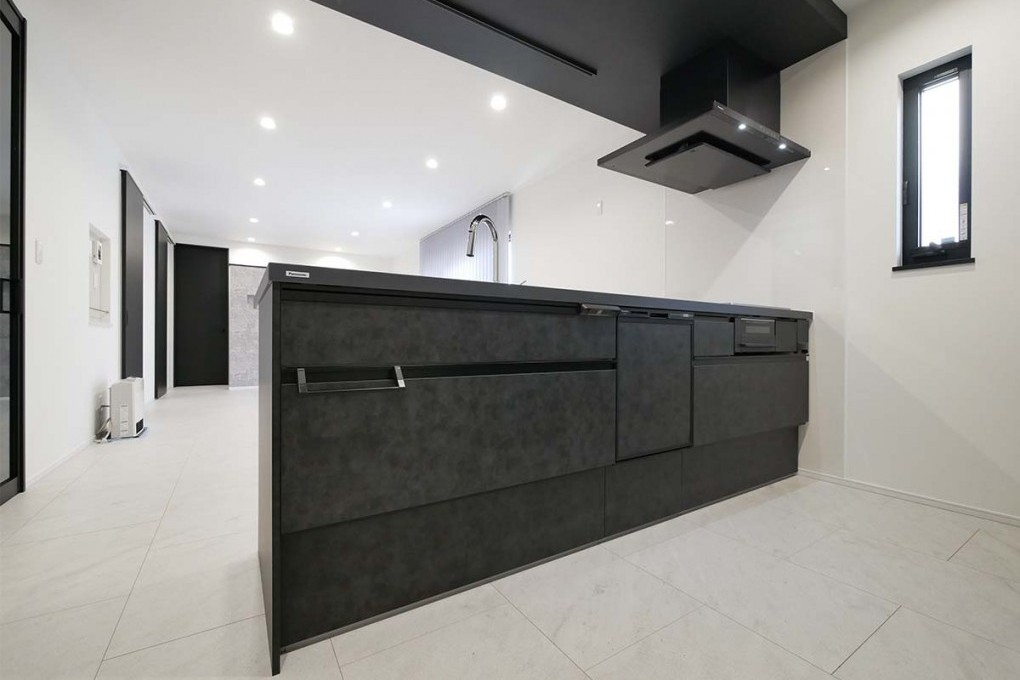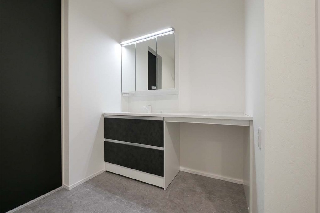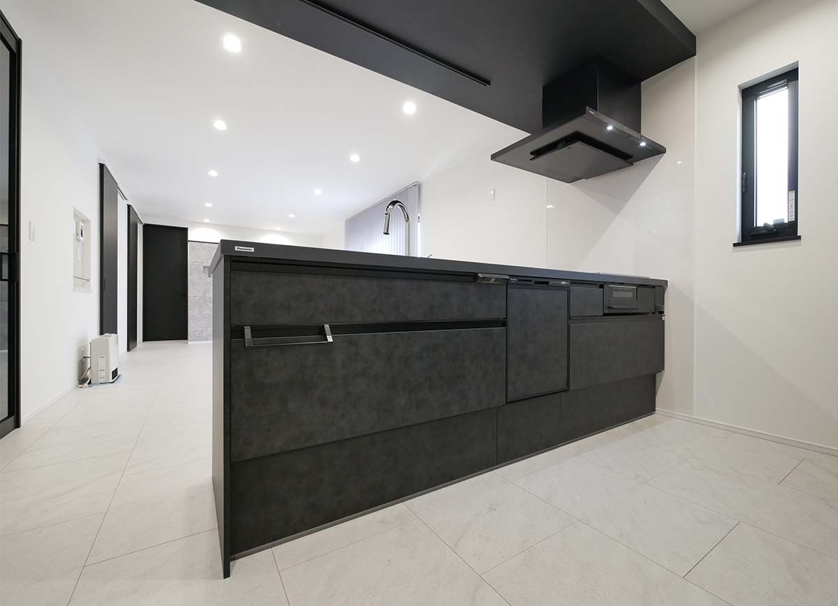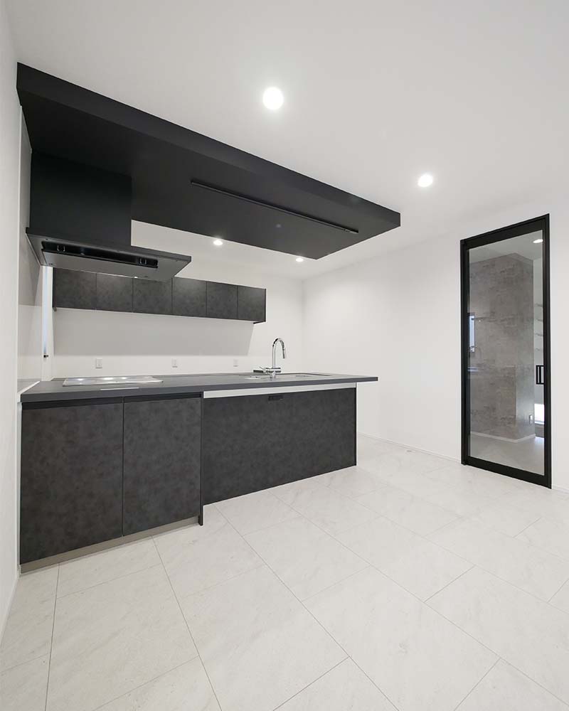 ブラックで統一したキッチンが映える、洗練された水廻り空間。すっきりとした動線で、毎日の家事を快適にサポートします。