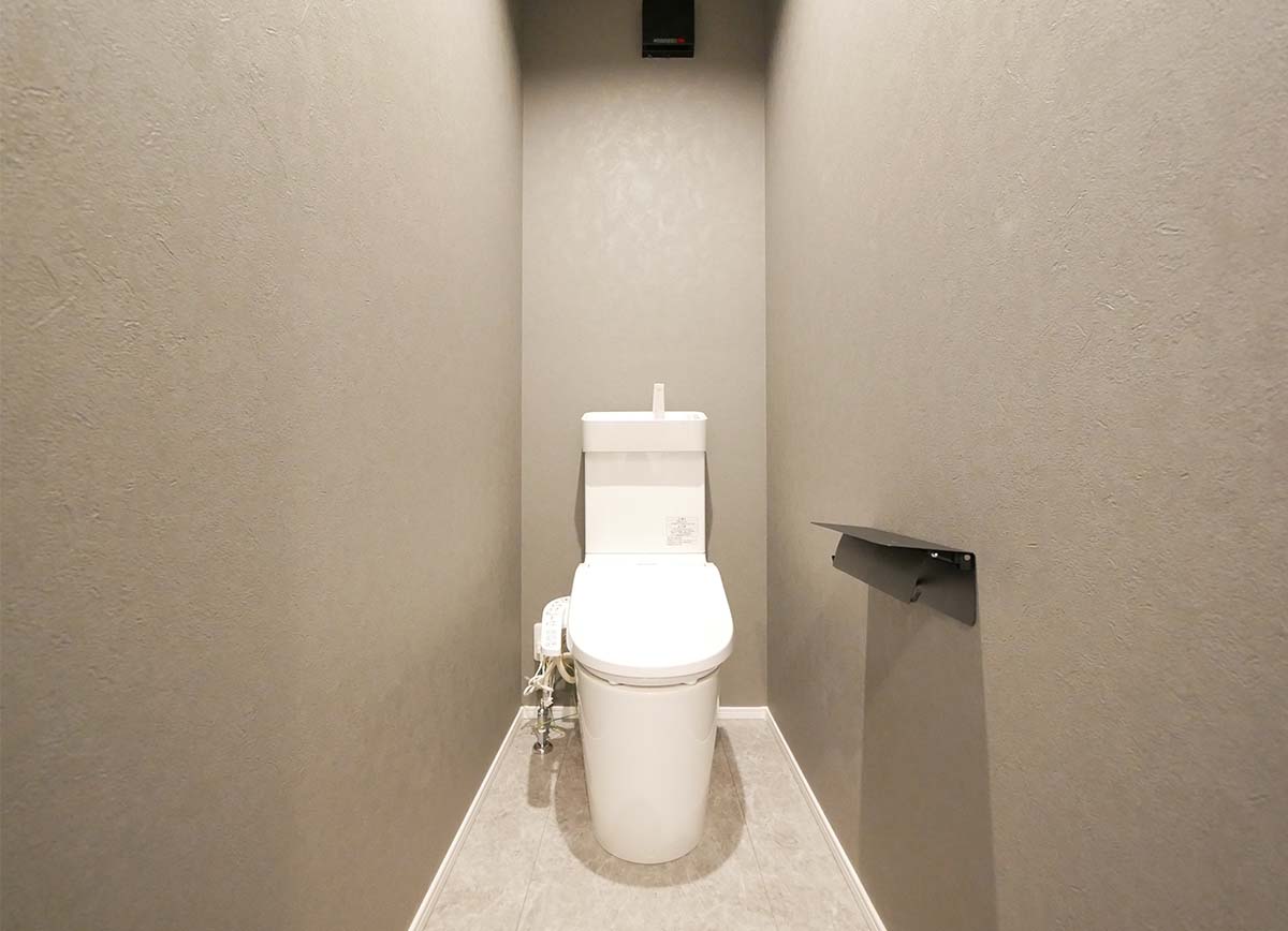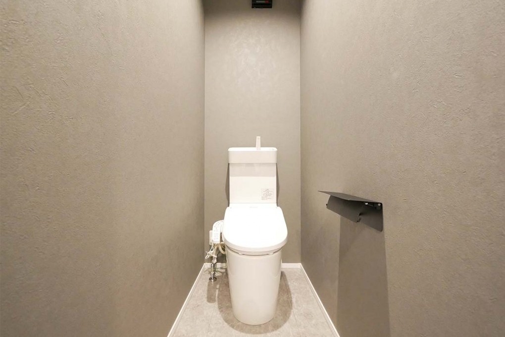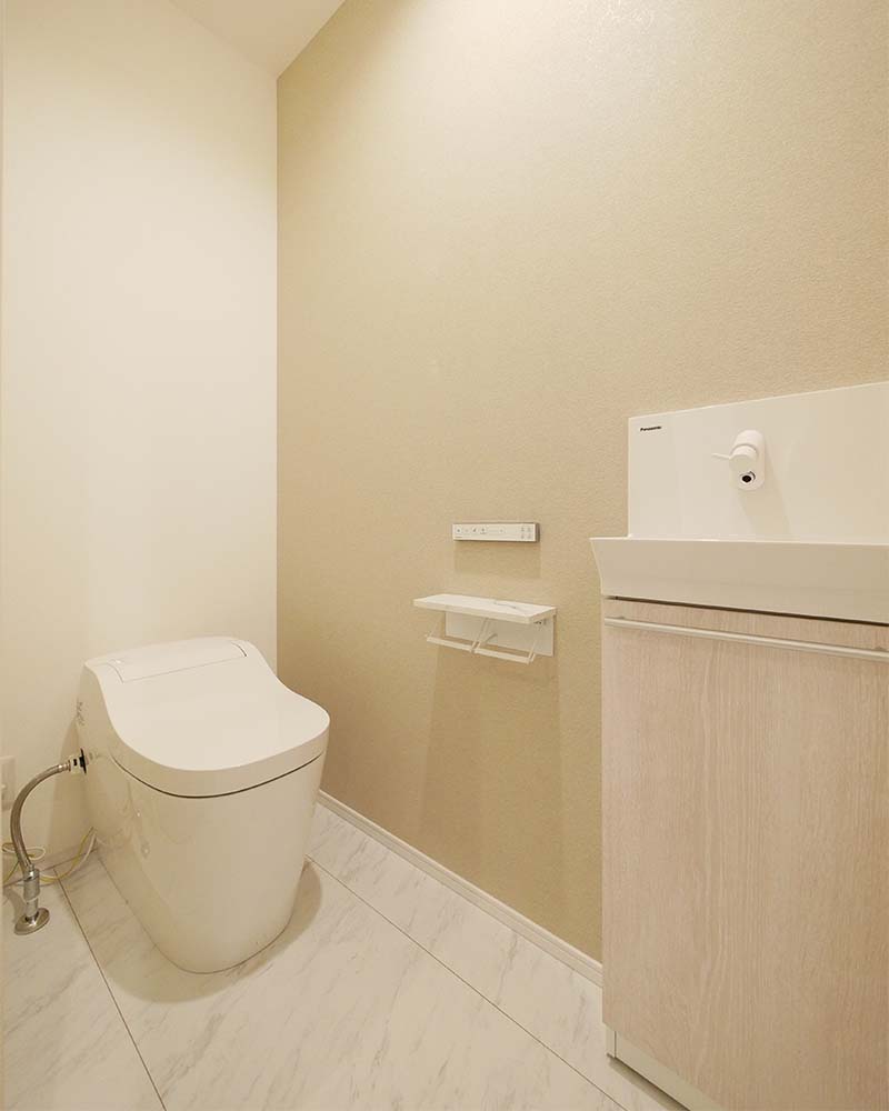 やさしい色味でまとめた、明るく清潔感のあるトイレ空間。手洗い付きで使い勝手にも配慮した、心地よい設えです。