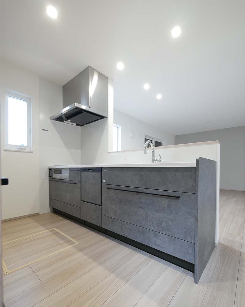 石目調の質感が美しい、スタイリッシュなキッチン。開放感のあるレイアウトで、家族との会話も楽しめる心地よい空間です。