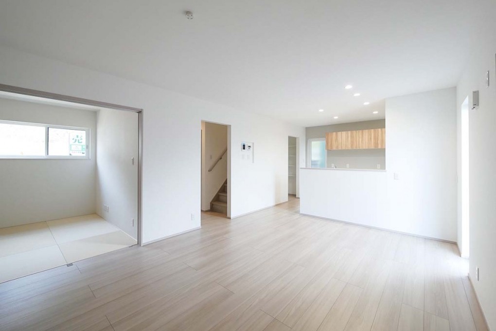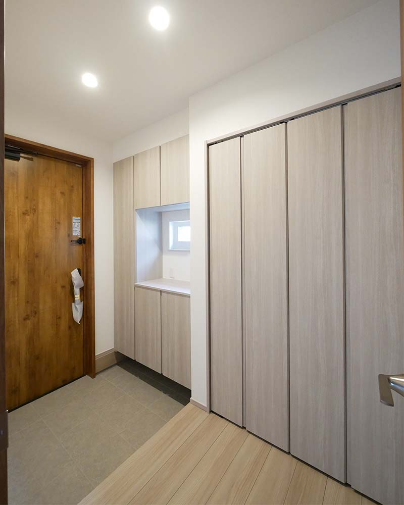 木目の収納が美しく並ぶ、すっきりとした玄関空間。大容量の収納で、いつでも気持ちよくお客さまを迎えられます。