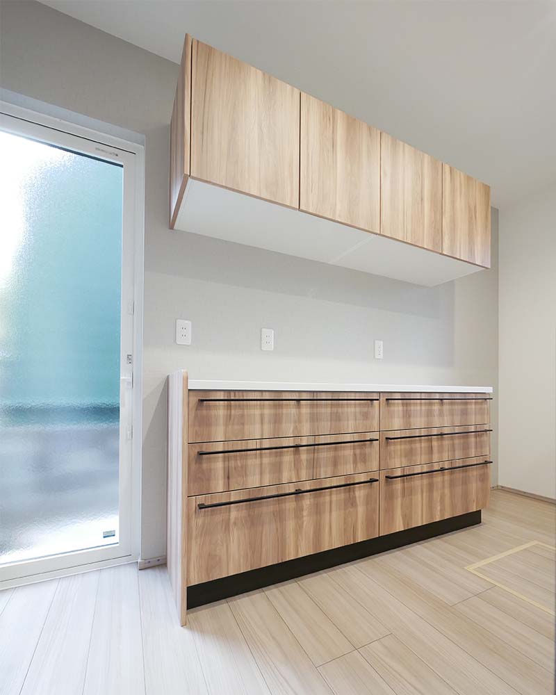 木目のやさしさが映える、ナチュラルテイストのカップボード。収納力もしっかり確保し、キッチン空間をすっきり美しく整えます。