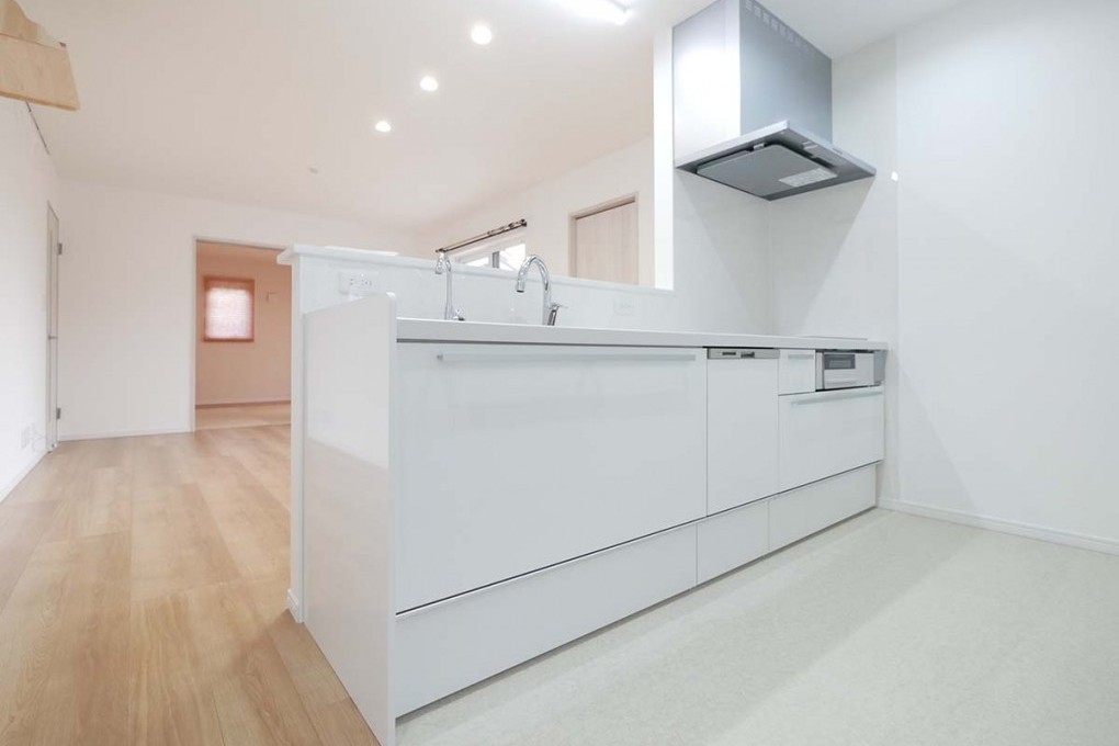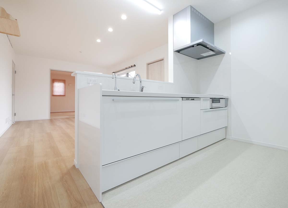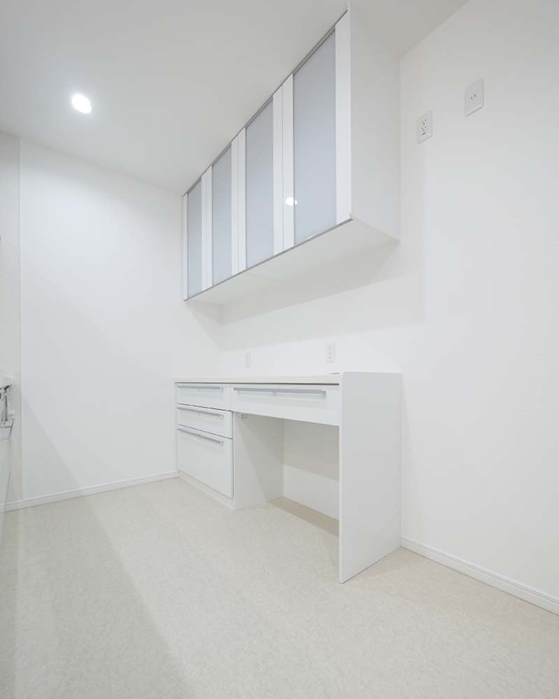 家電や食器をすっきり収められる、機能的なカップボード。作業スペースも確保でき、毎日の家事がはかどります。