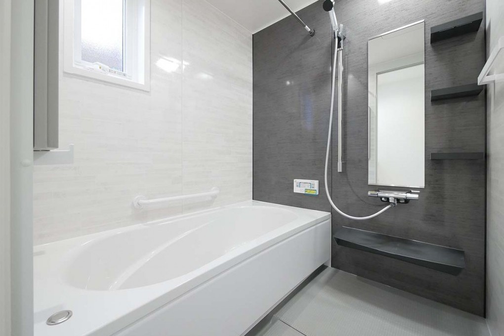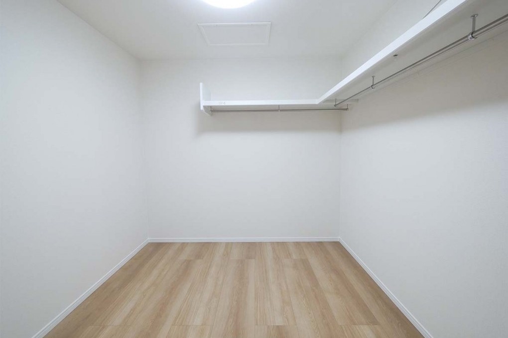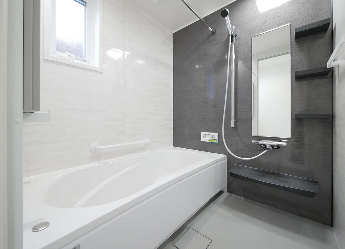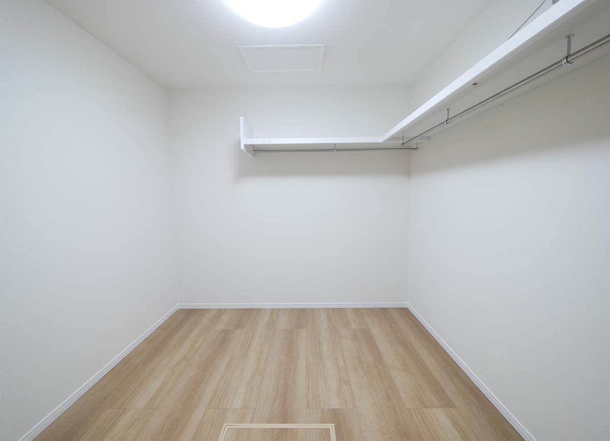 白を基調にした、明るく清潔感のある脱衣室。洗面台と洗濯スペースがまとまり、家事動線もスムーズです。