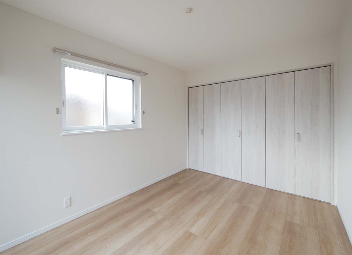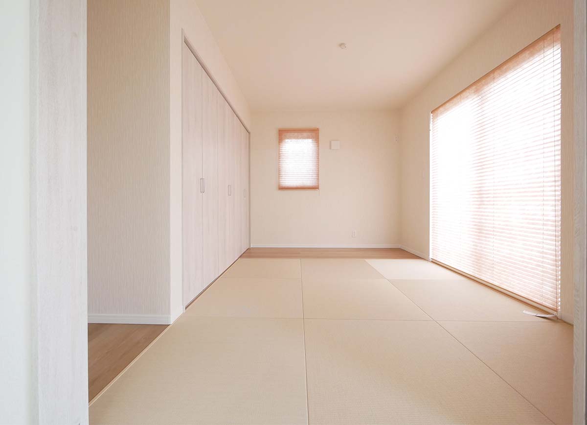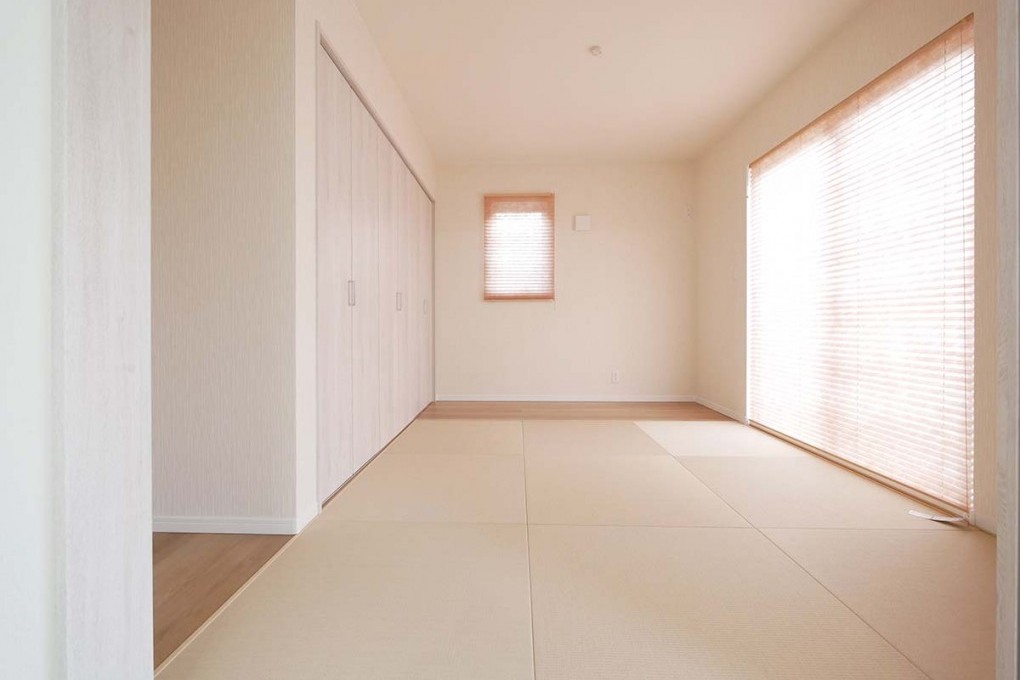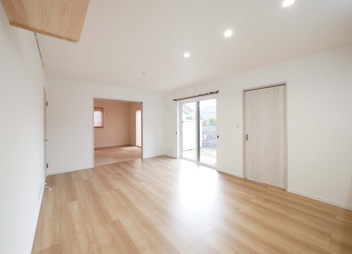 白を基調にした、明るく清潔感のある脱衣室。洗面台と洗濯スペースがまとまり、家事動線もスムーズです。