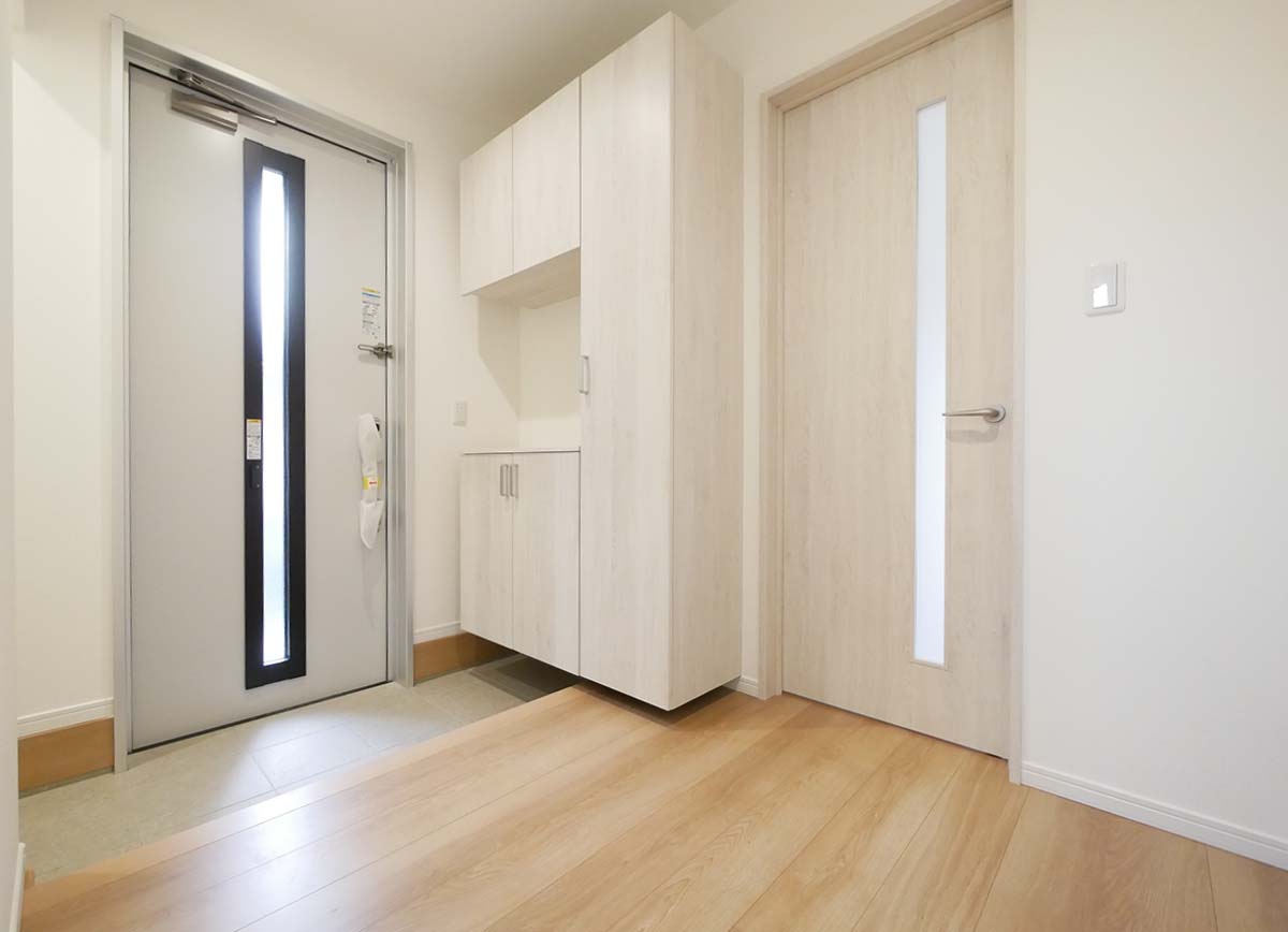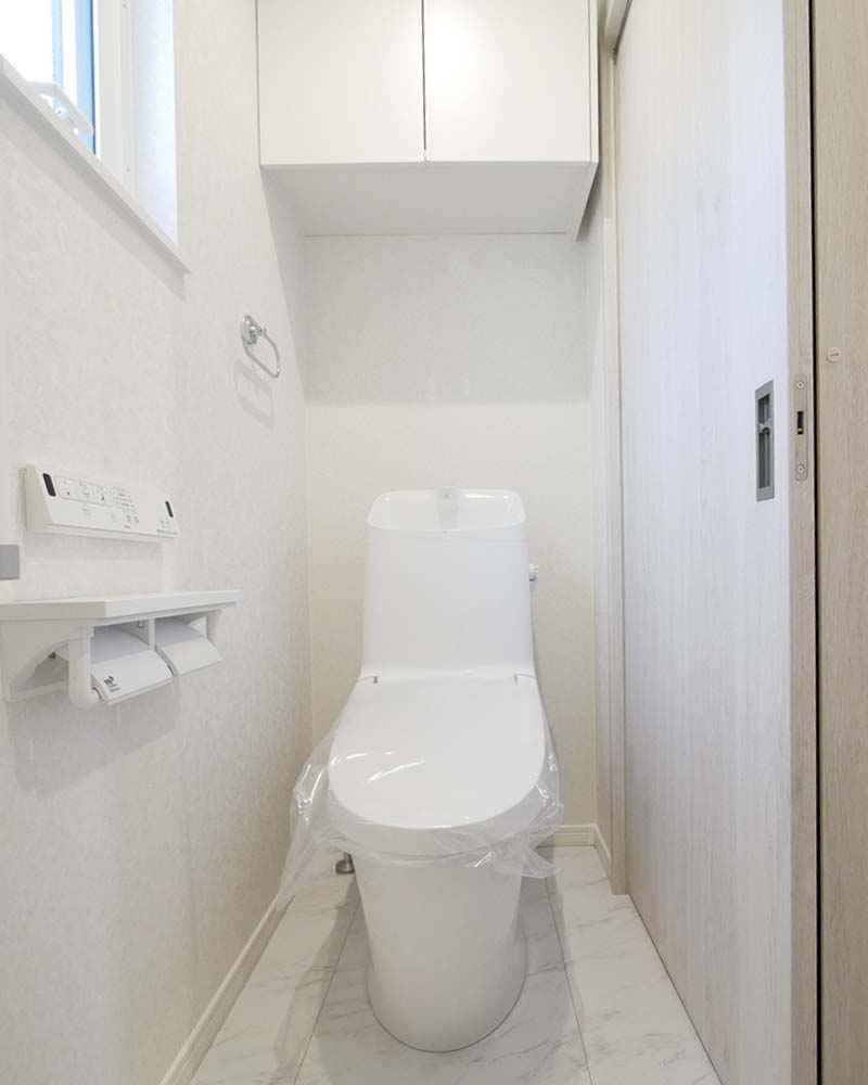 清潔感のあるシンプルなトイレ空間。上部収納付きで、生活感を抑えながらすっきり使えます。