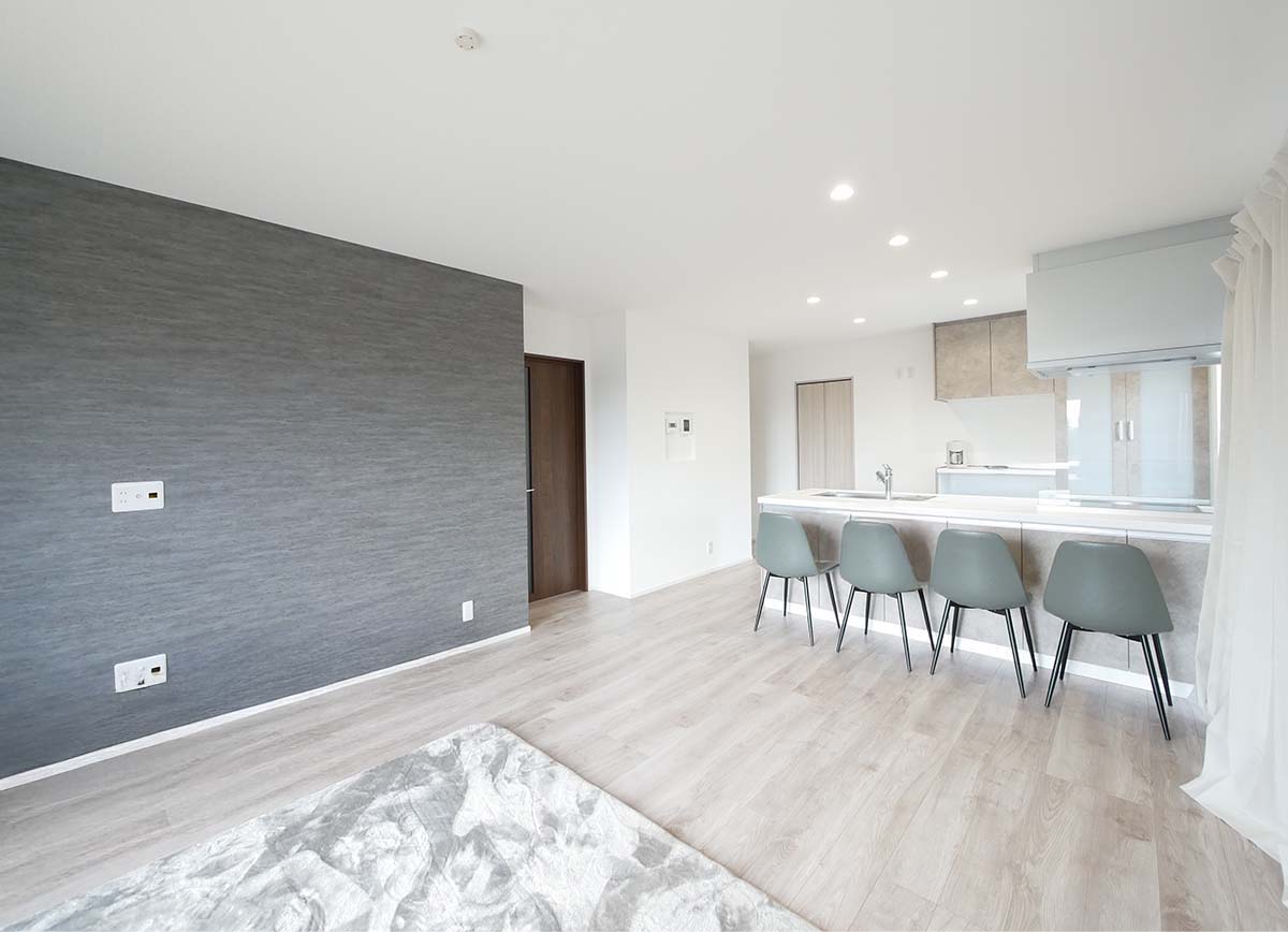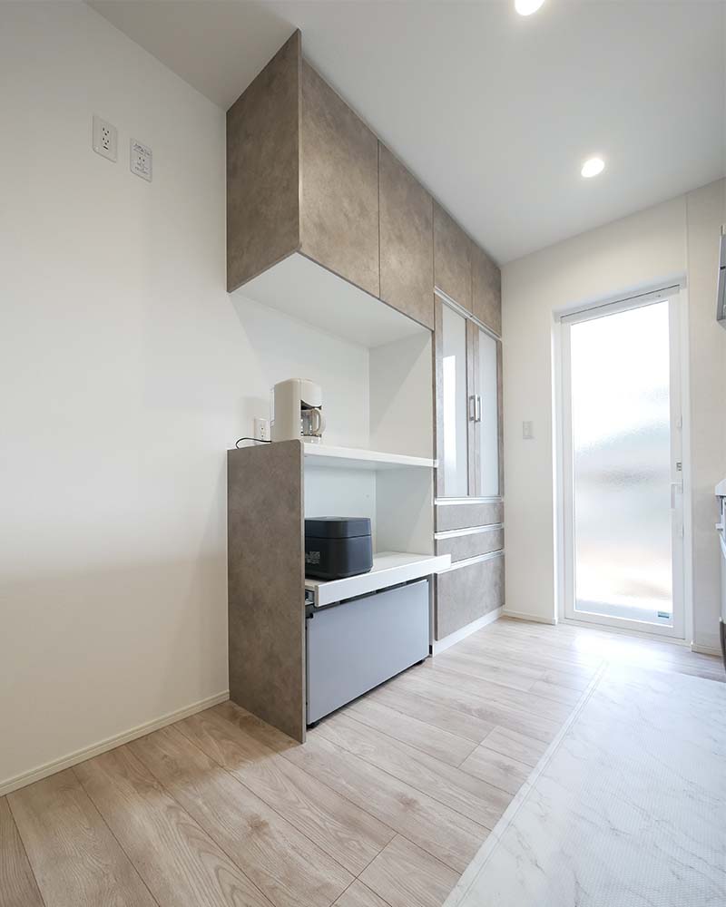 キッチンと統一感のあるデザインで、空間にすっきりと馴染むカップボード。家電や収納を美しくまとめ、家事がはかどる機能的なスペースです。