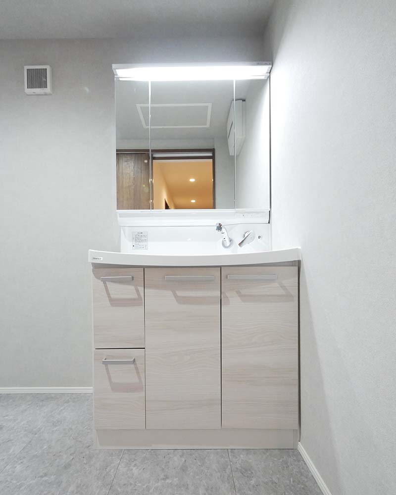 明るく清潔感のある洗面化粧台で、朝の身支度も気持ちよく。収納力にも配慮し、すっきりと整った空間を保てます。
