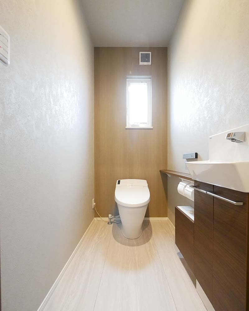 木目アクセントがやさしく映える、落ち着きのあるトイレ空間。コンパクトながらも、清潔感と使いやすさをしっかり備えています。