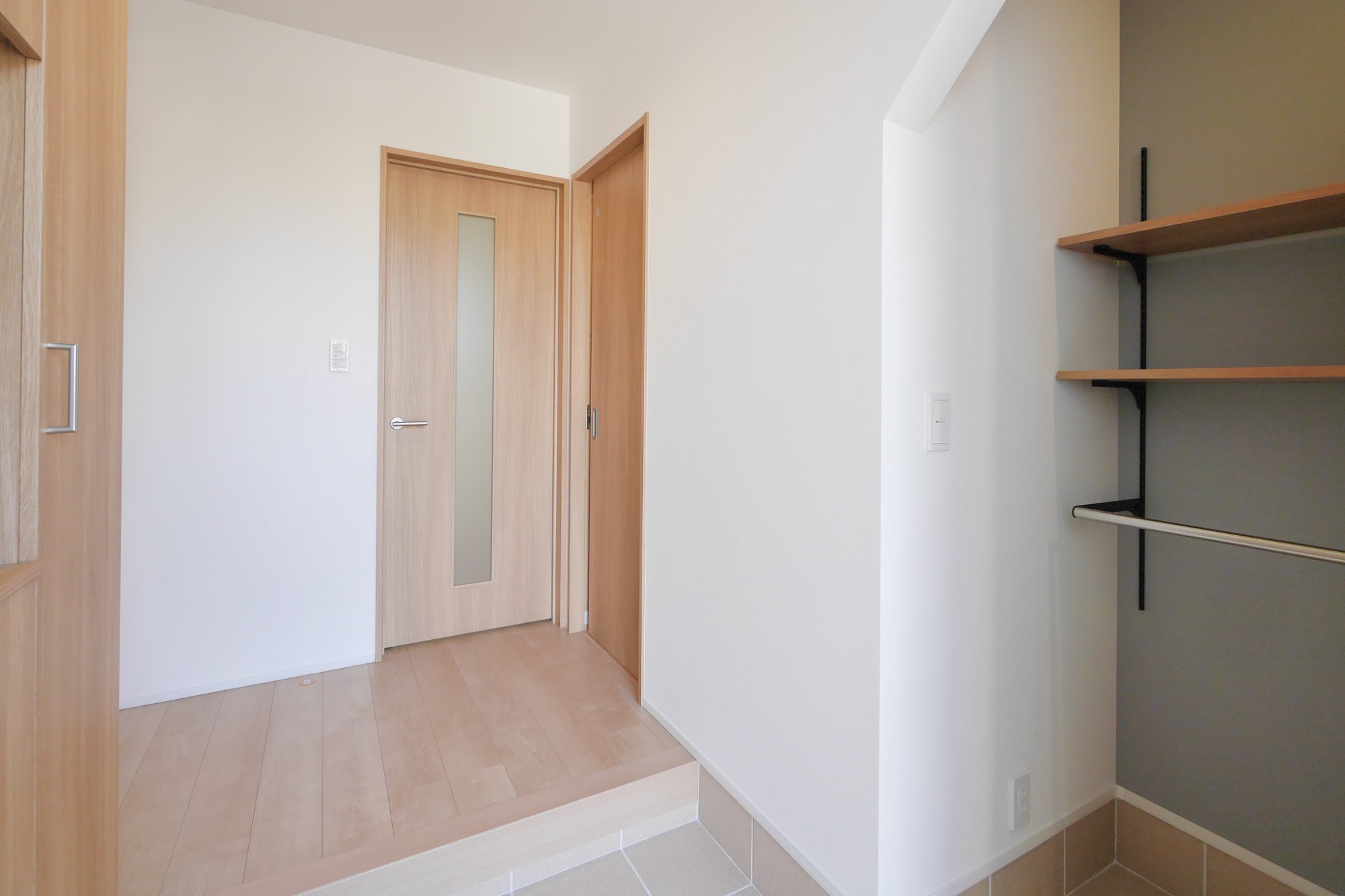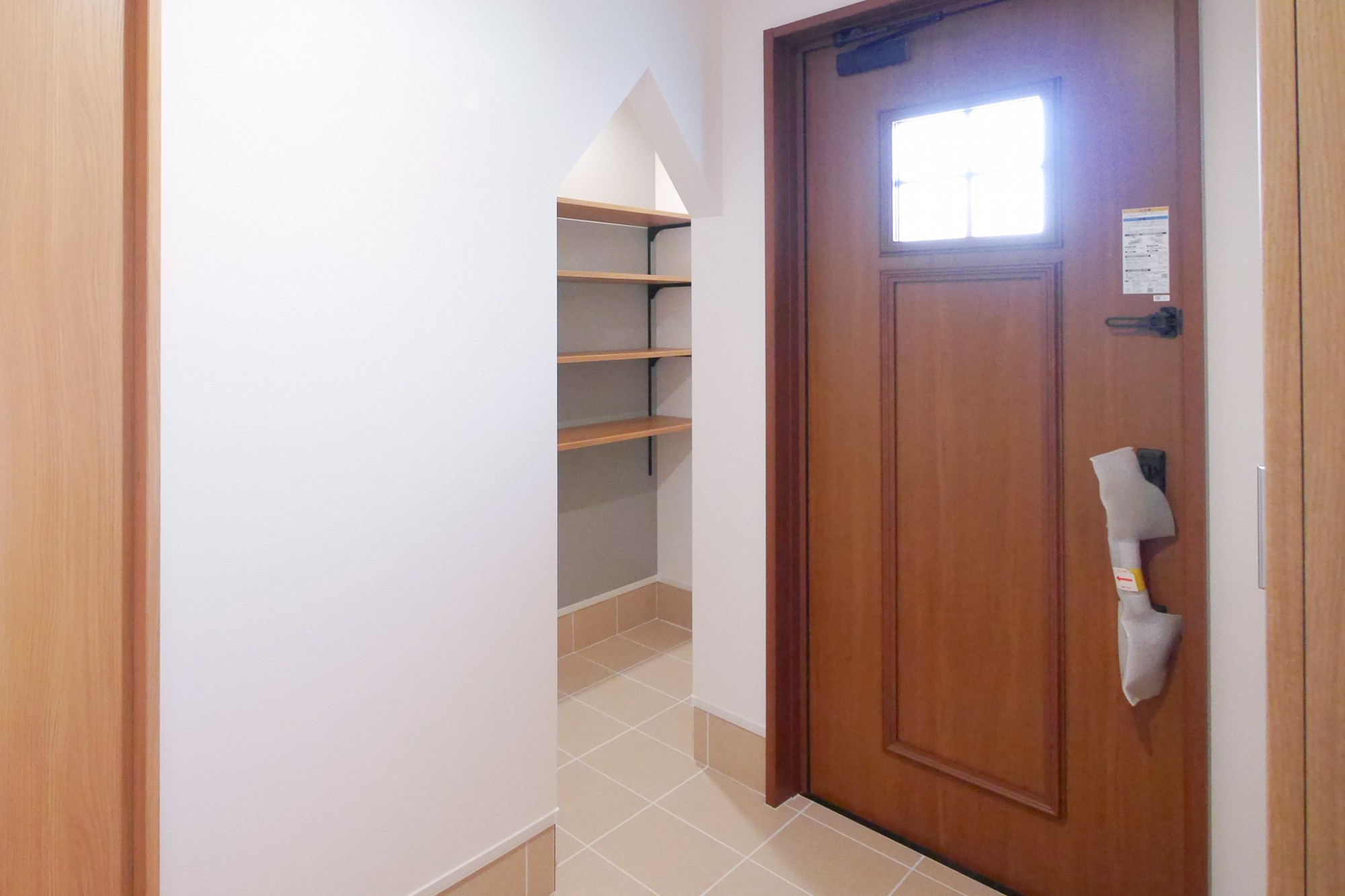 三角垂れ壁がアクセントとなるシューズクローク入口。