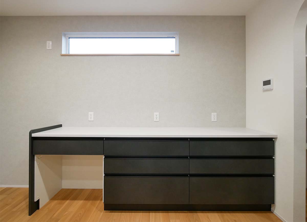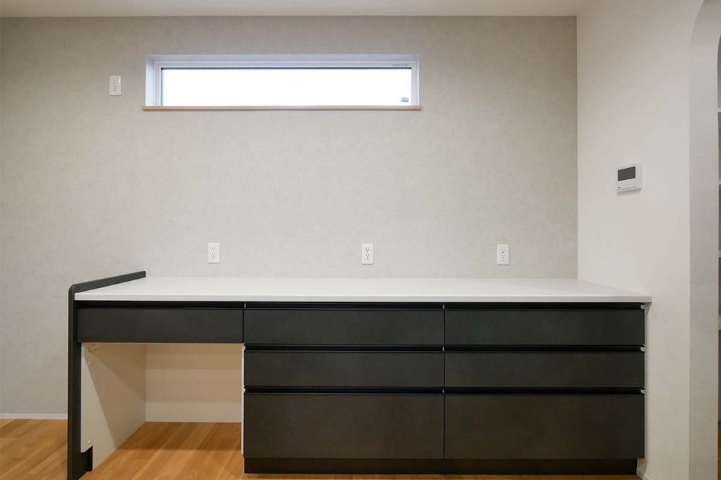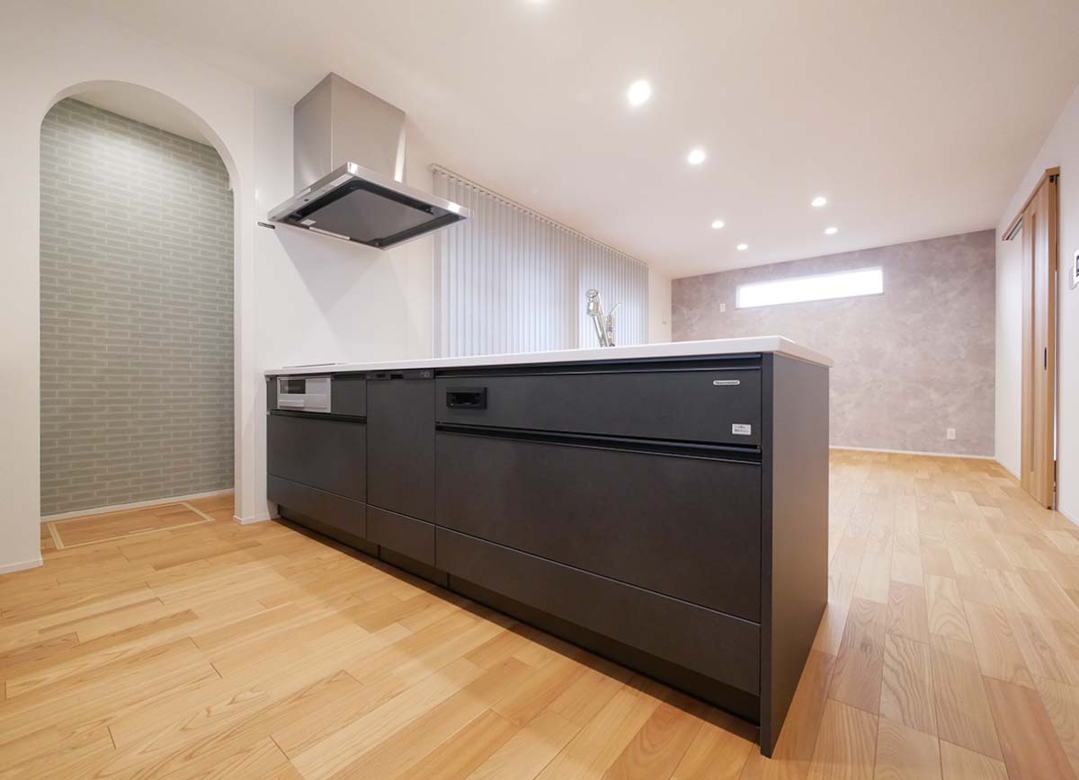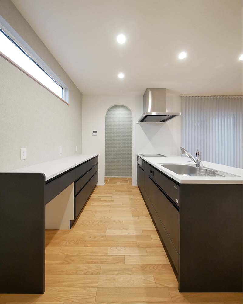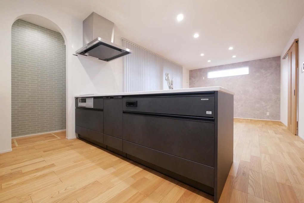 ブラックで統一したキッチンとカップボードが並ぶ、機能美あふれる空間。ゆとりある通路幅で、家事もスムーズに。