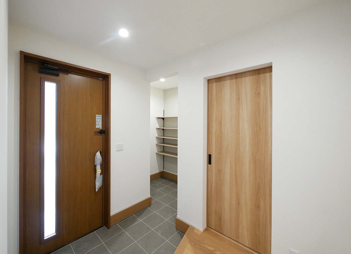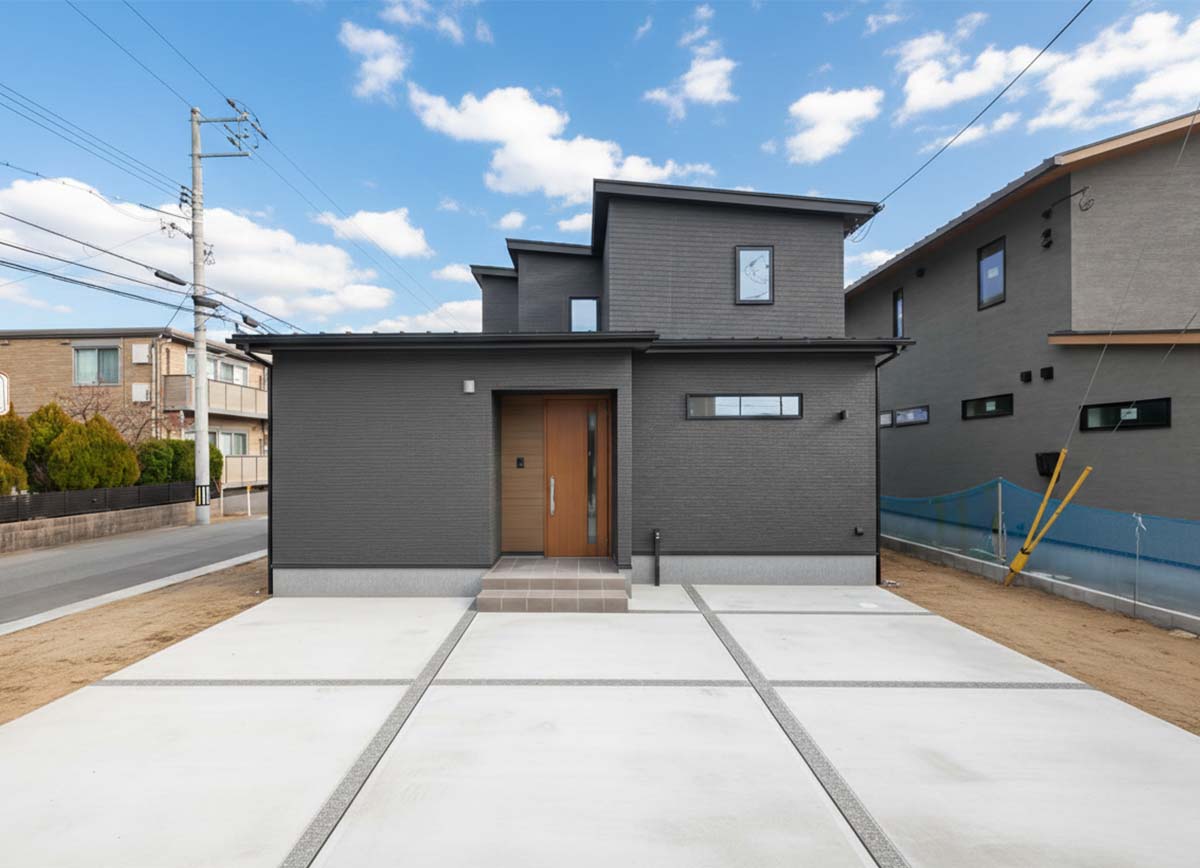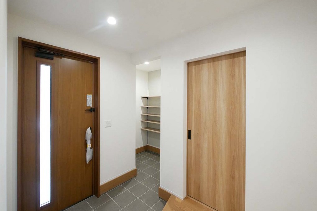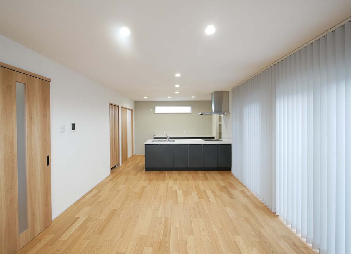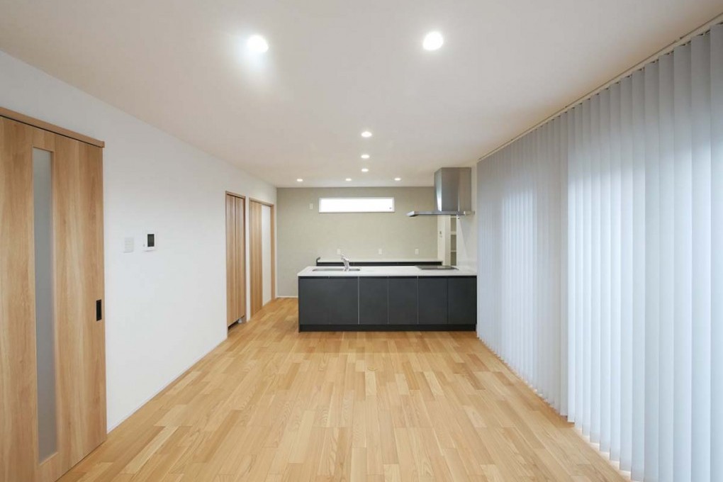 ブラックで統一したキッチンとカップボードが並ぶ、機能美あふれる空間。ゆとりある通路幅で、家事もスムーズに。