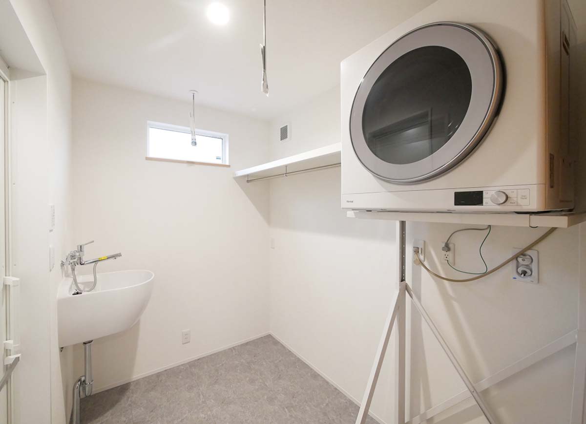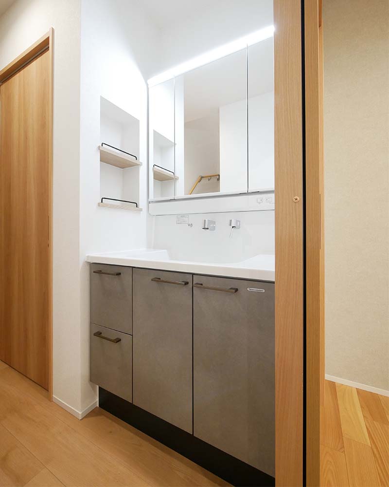 上質なグレートーンが映える、洗練された洗面スペース。ニッチ棚を設けることで、使いやすさとデザイン性を両立しました。