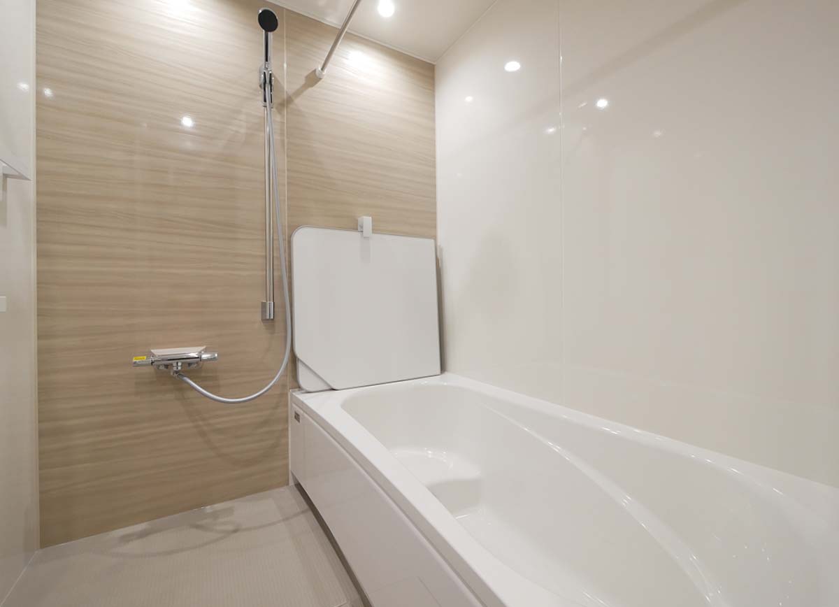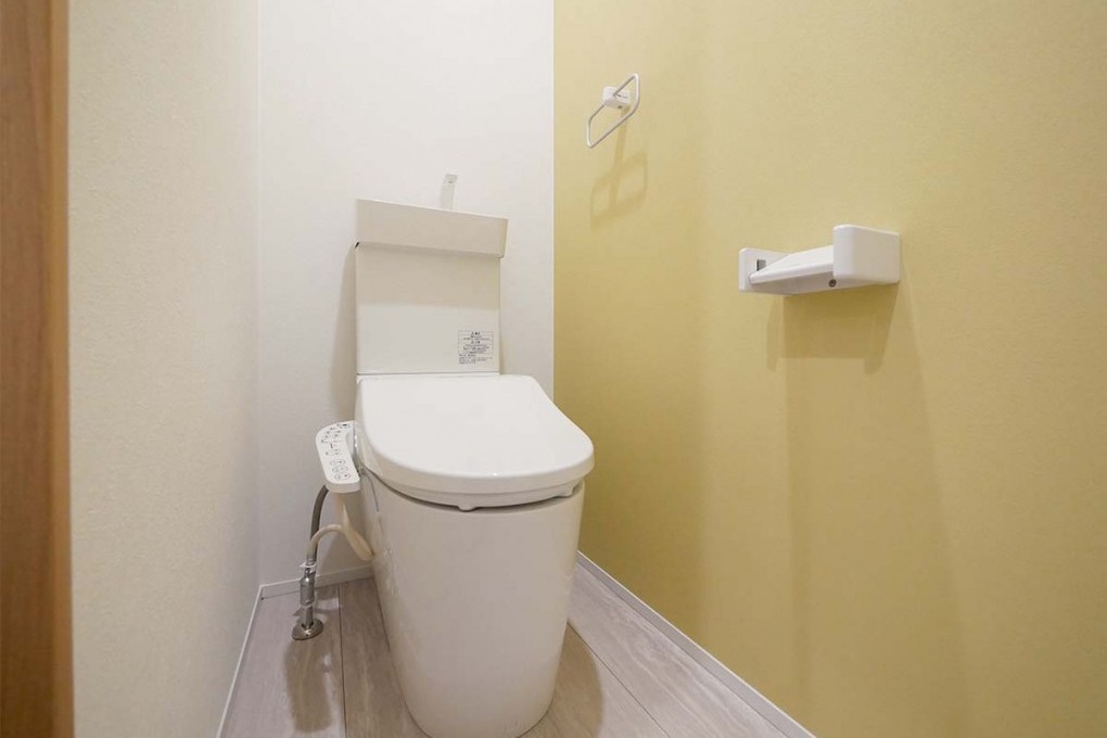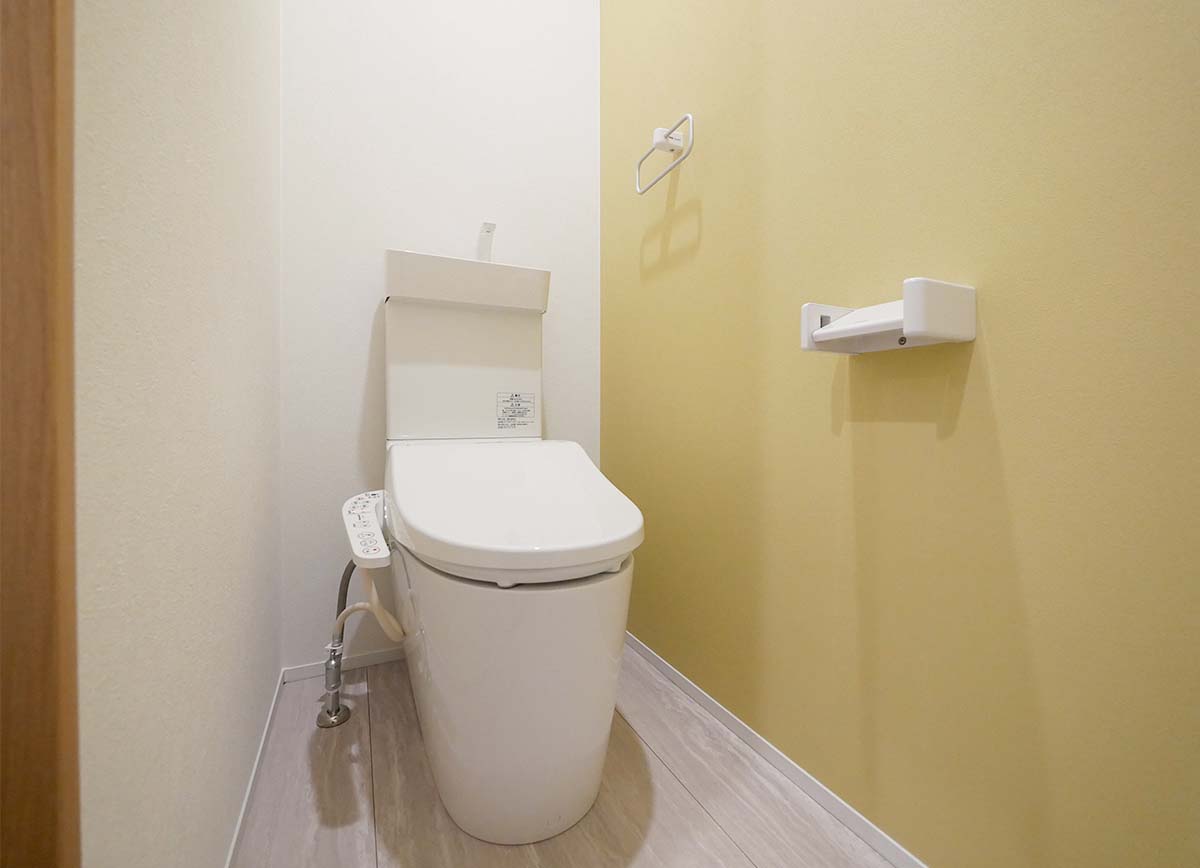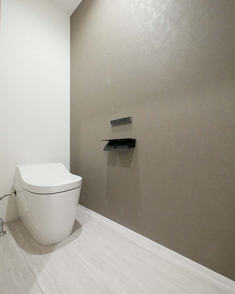 シックなアクセントクロスが映える、落ち着きのあるトイレ空間。タンクレスタイプで空間もすっきりと、広がりを感じられる設計です。