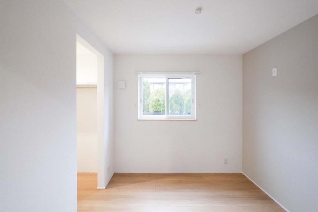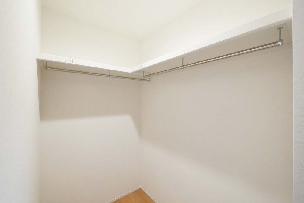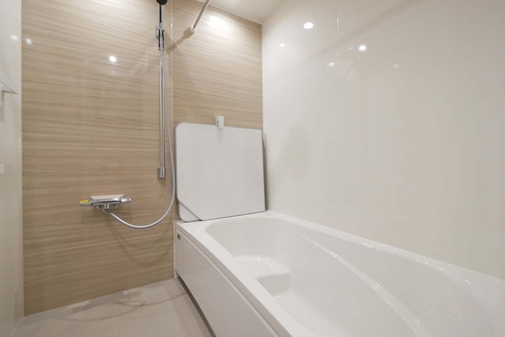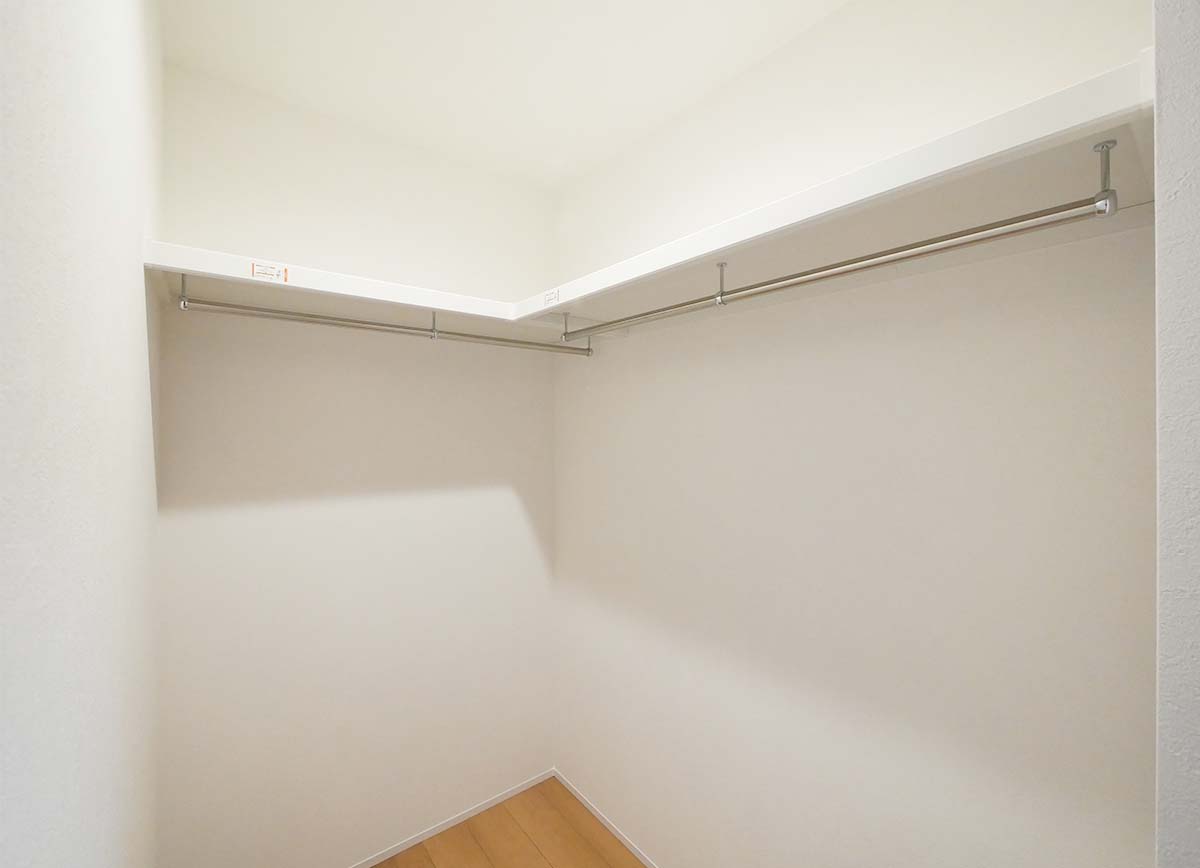 シックなアクセントクロスが映える、落ち着きのあるトイレ空間。タンクレスタイプで空間もすっきりと、広がりを感じられる設計です。