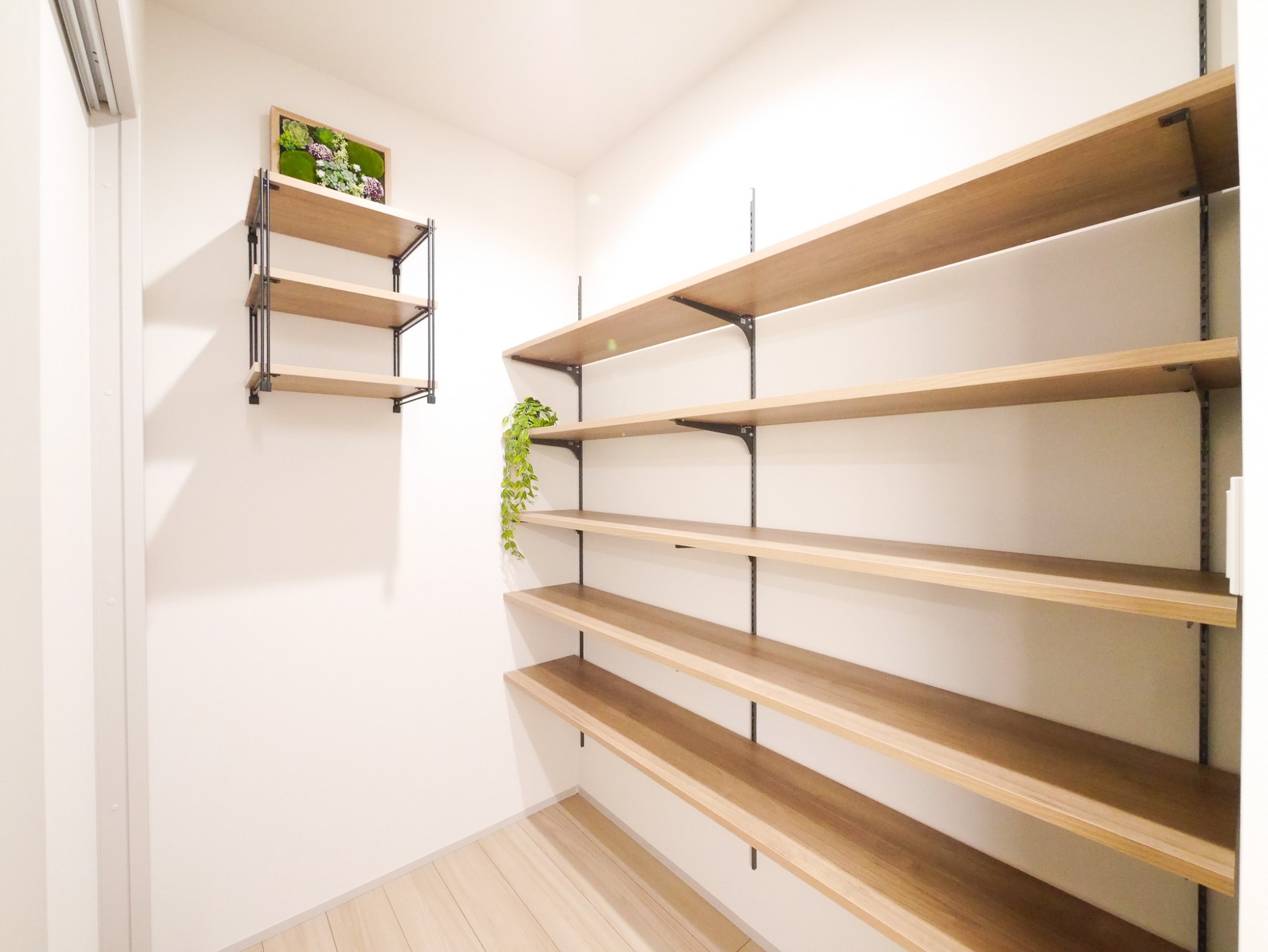 1.5帖のパントリーは可動棚付きで、食品ストックや日用品を用途に合わせて整理可能。