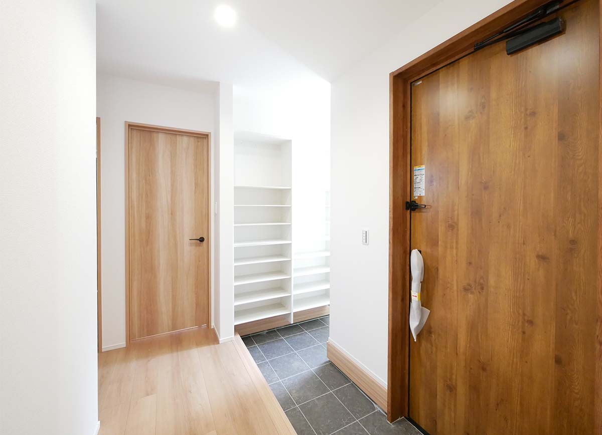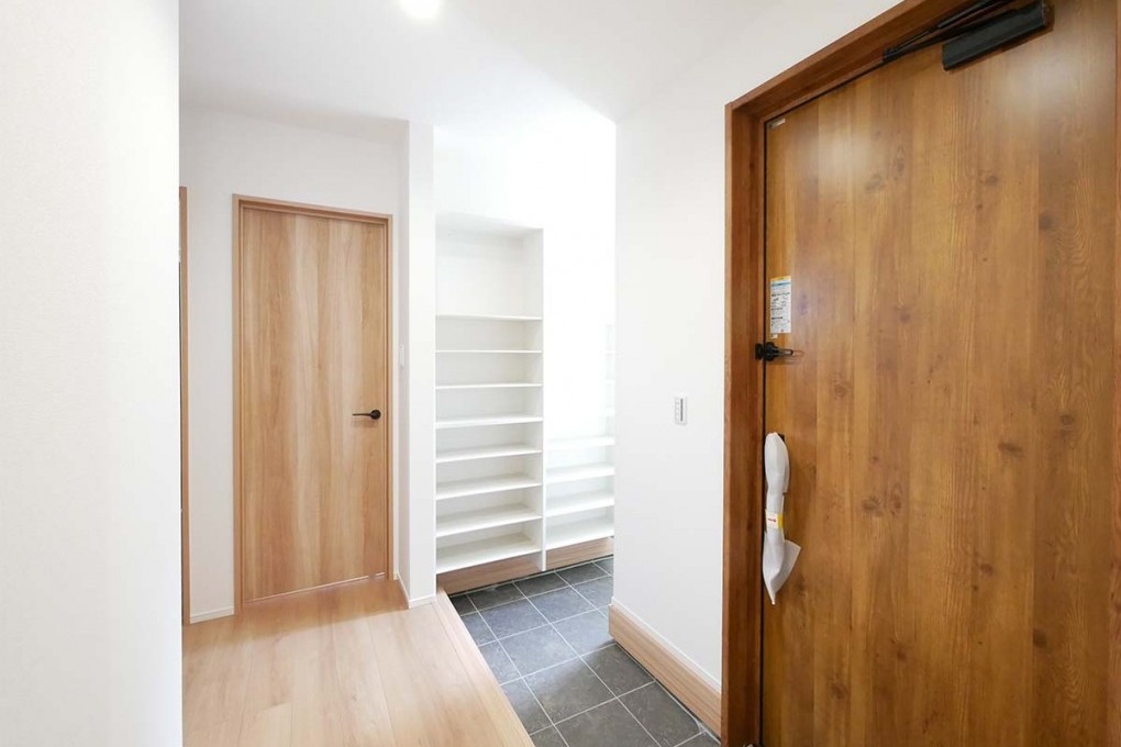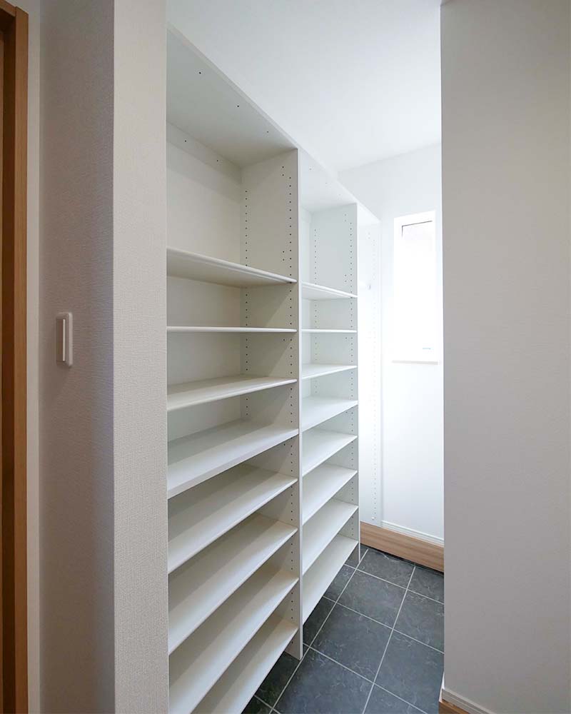 靴やアウトドア用品もすっきり収納できるシューズクローク。可動棚付きで、用途に合わせて使いやすく整理できます。