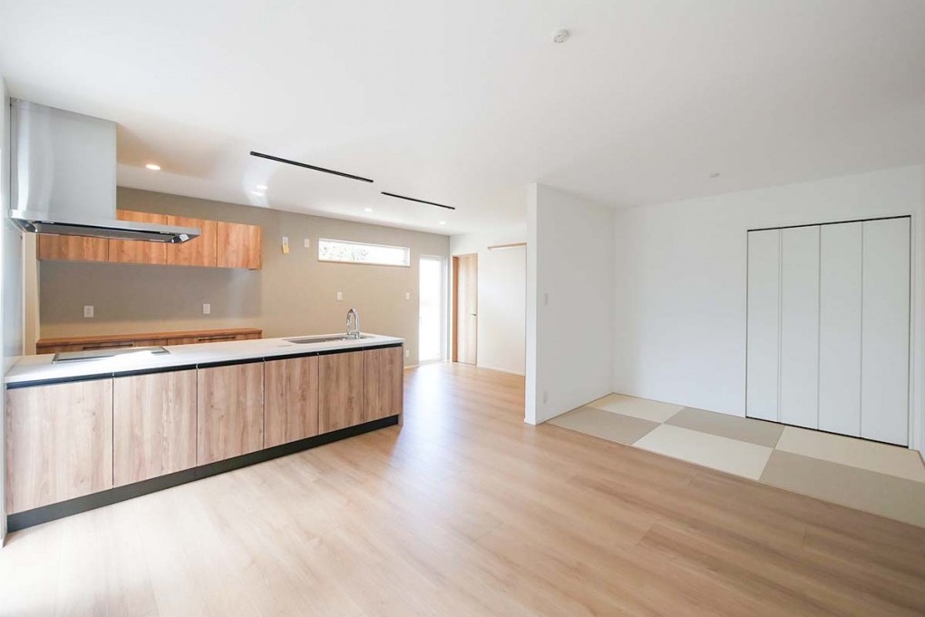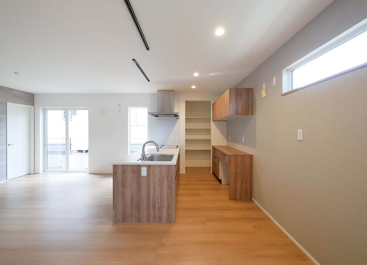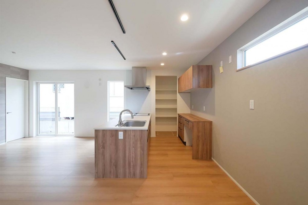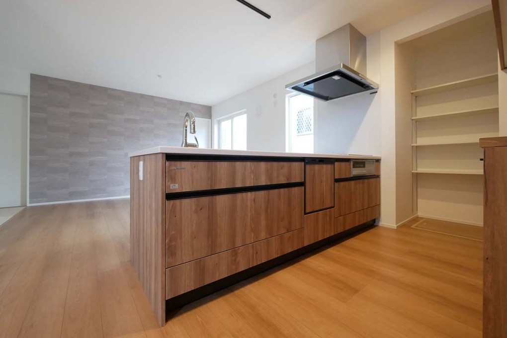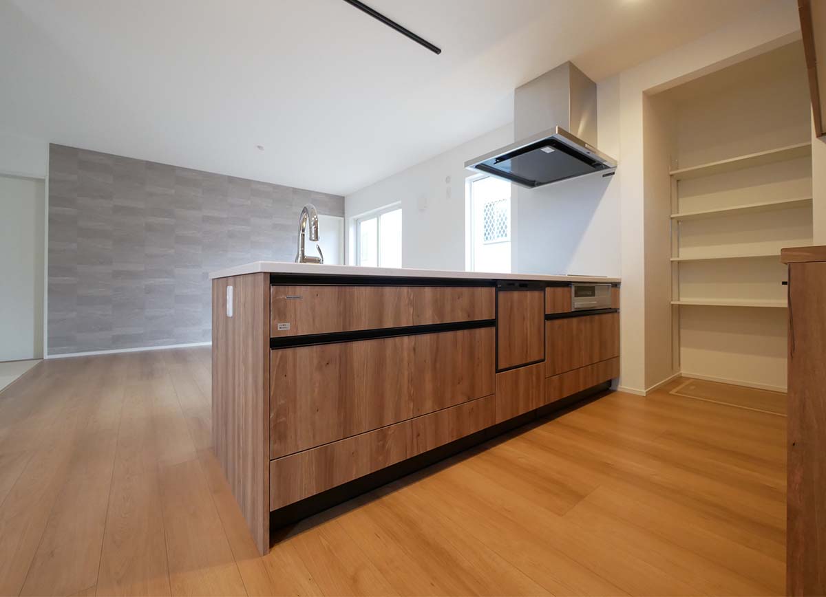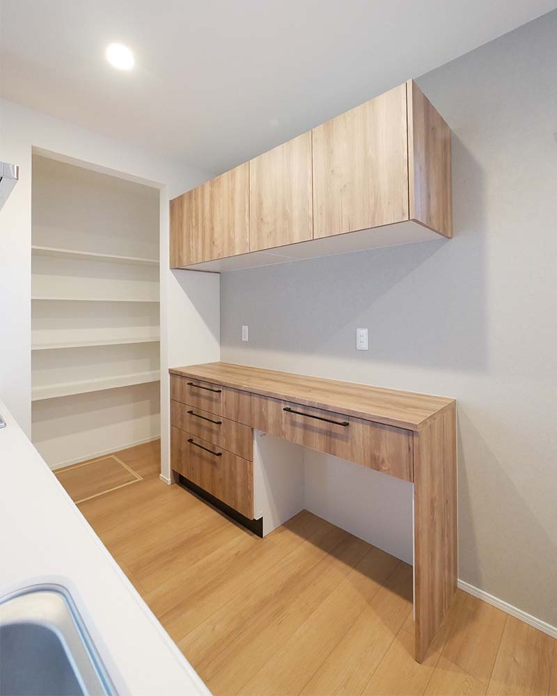 収納力のあるカップボードで、キッチンまわりもすっきり整います。パントリーも備え、食材や調理器具をしっかり収納できます。