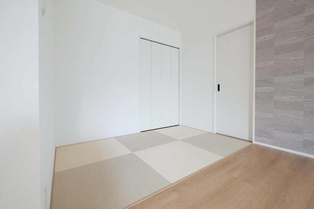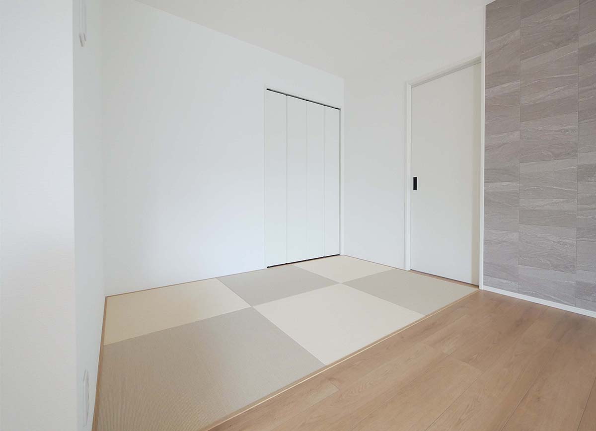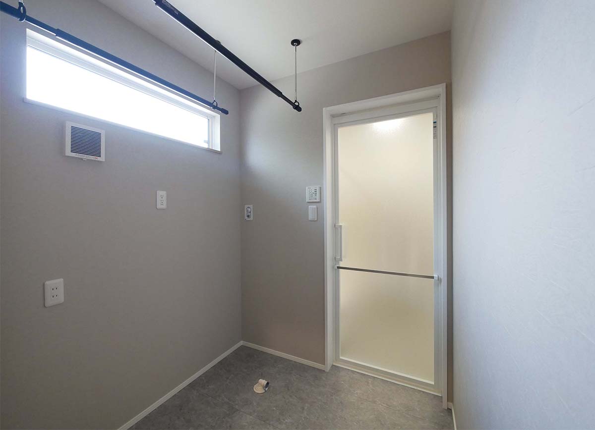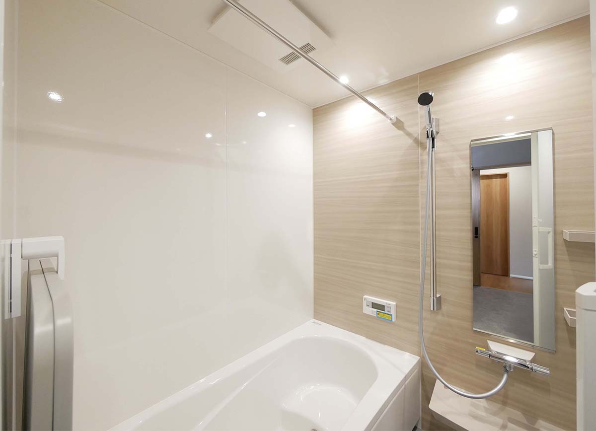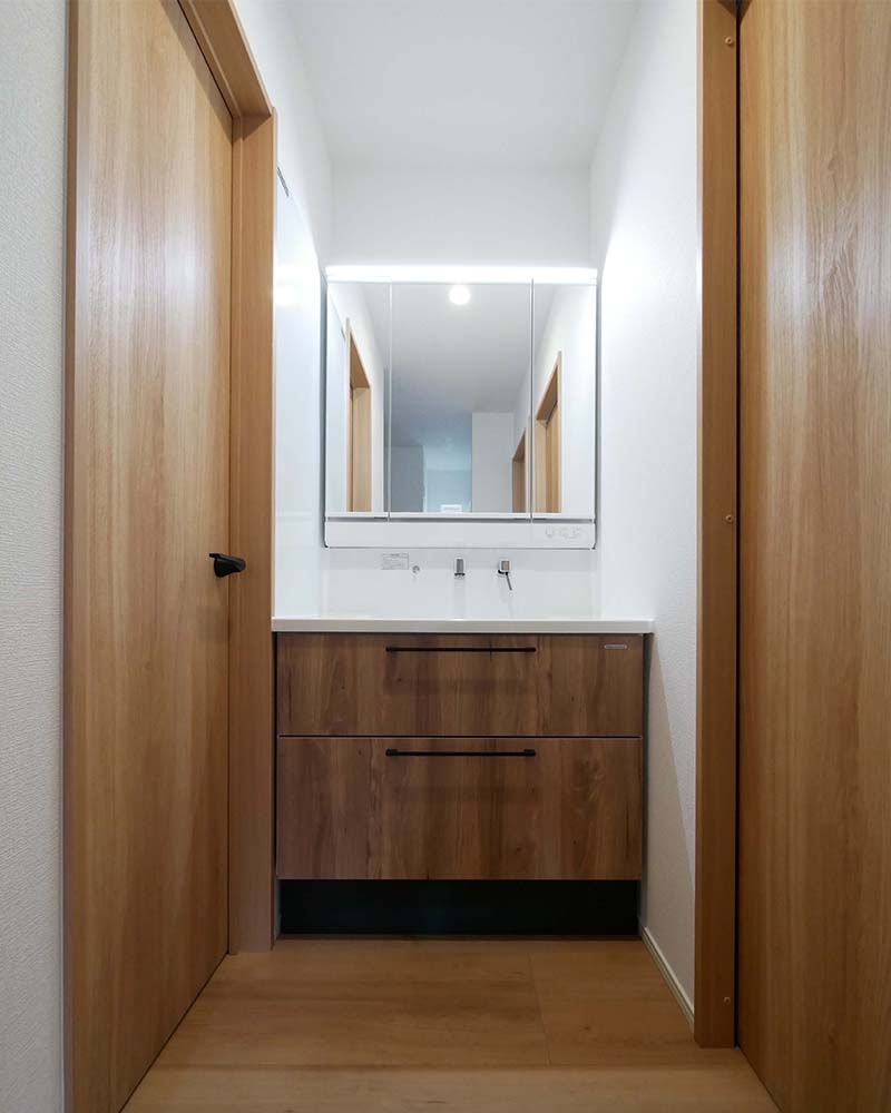 収納力のある洗面化粧台で、洗面まわりもすっきり整います。三面鏡付きで、毎日の身支度も快適に行えます。