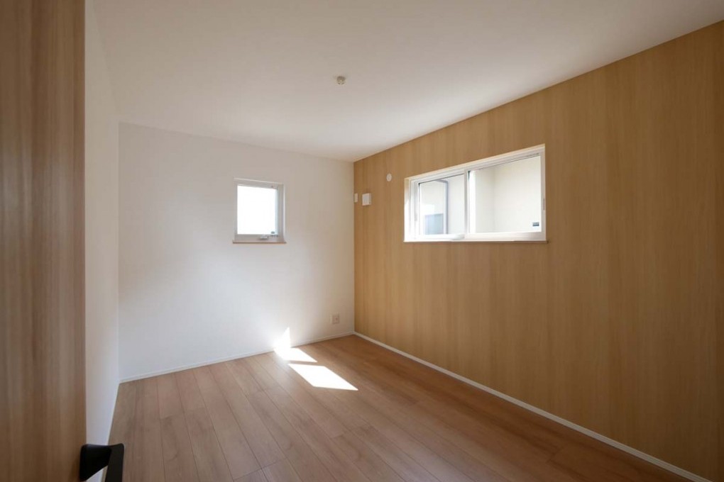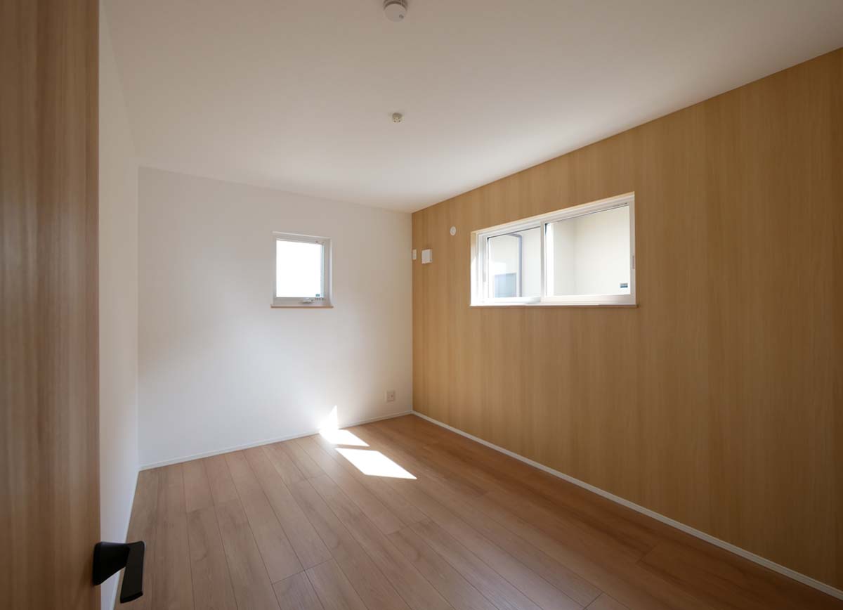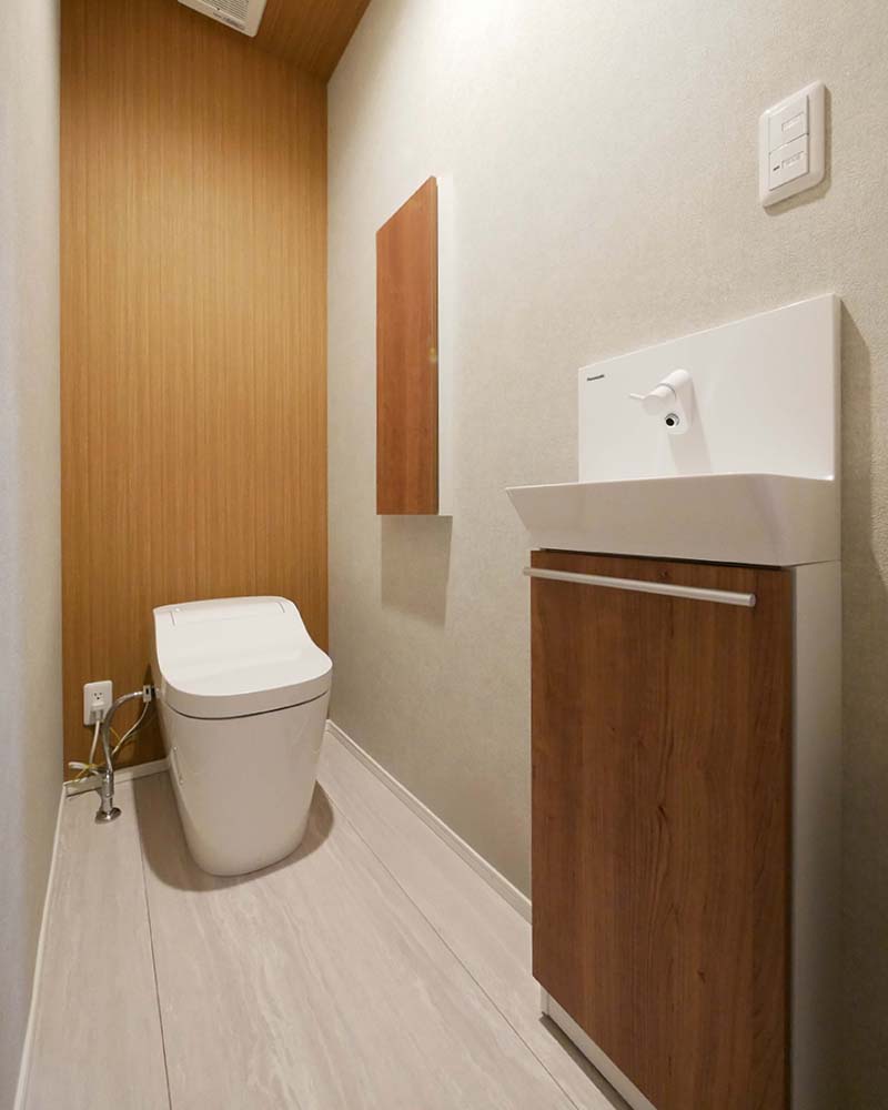 木目のアクセントが映える、落ち着きのあるトイレ空間。手洗いカウンター付きで、使いやすさにも配慮しています。