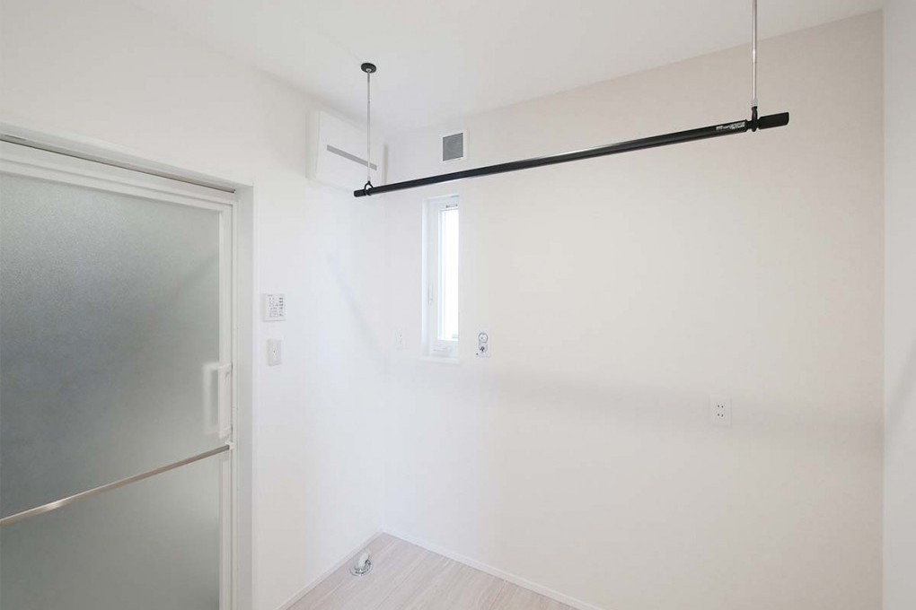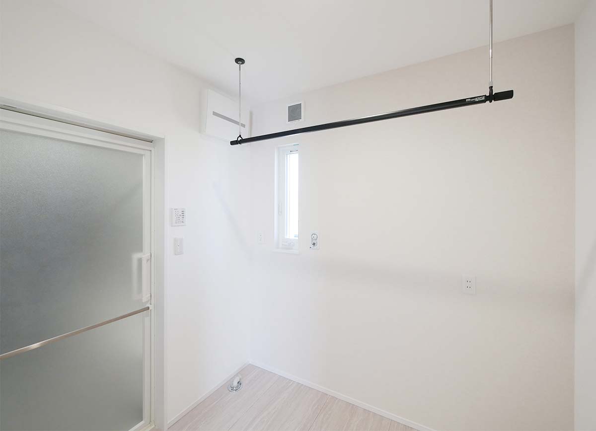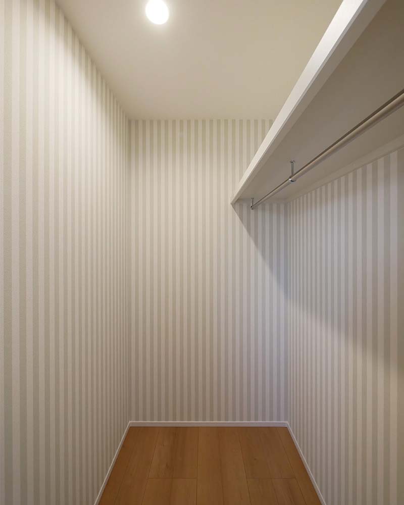 ストライプ柄のクロスがおしゃれなウォークインクローゼット。衣類や小物をまとめて収納でき、すっきりと片付く空間です。