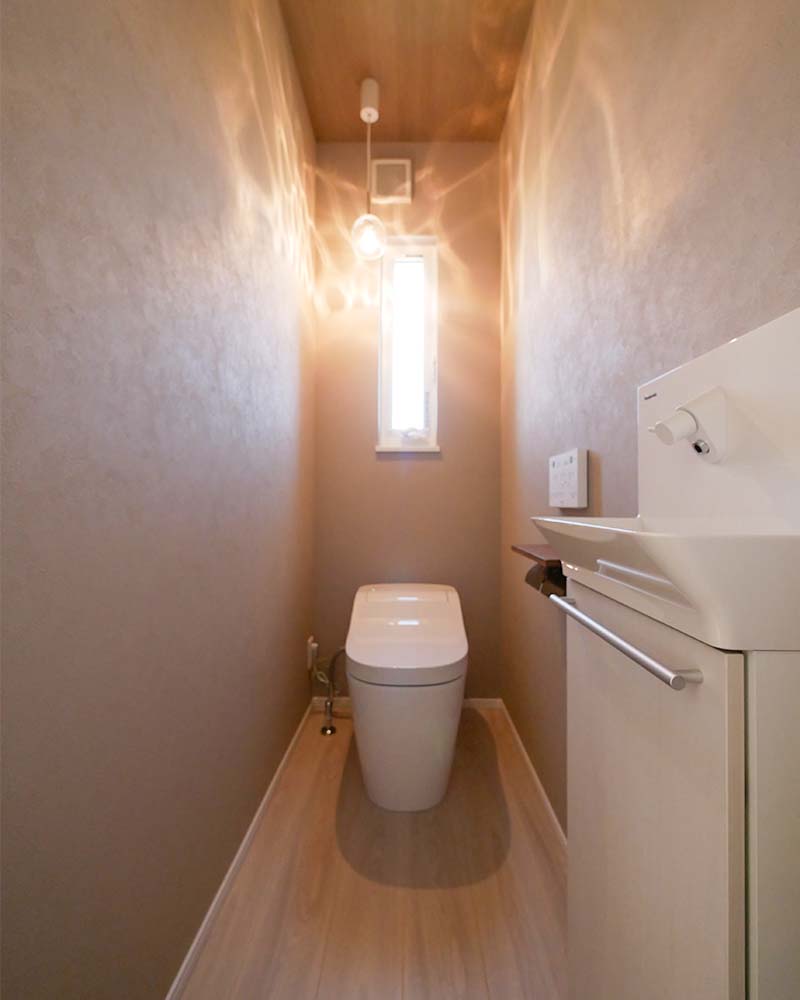 落ち着いた色合いでまとめた、上質感のあるトイレ空間。ペンダントライトのやさしい光が、心地よい雰囲気を演出します。
