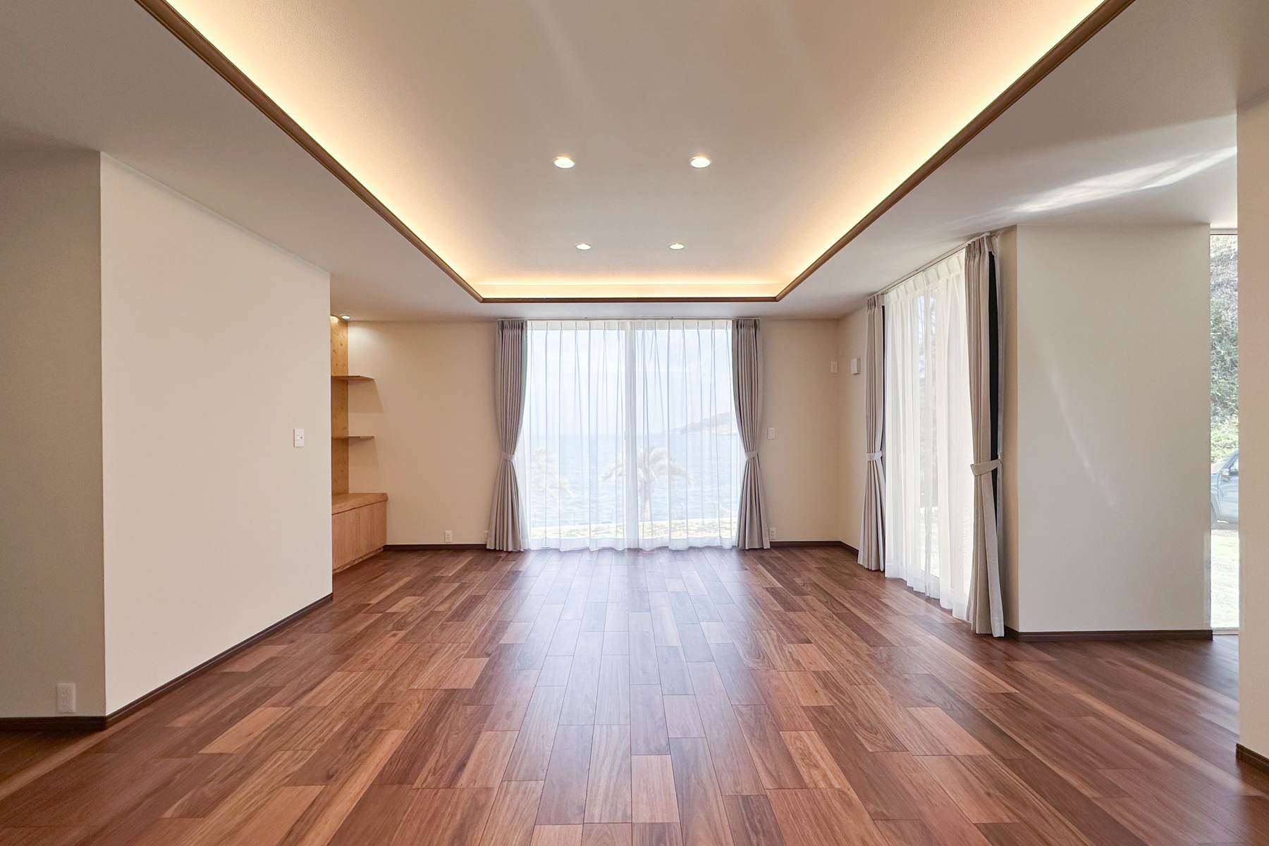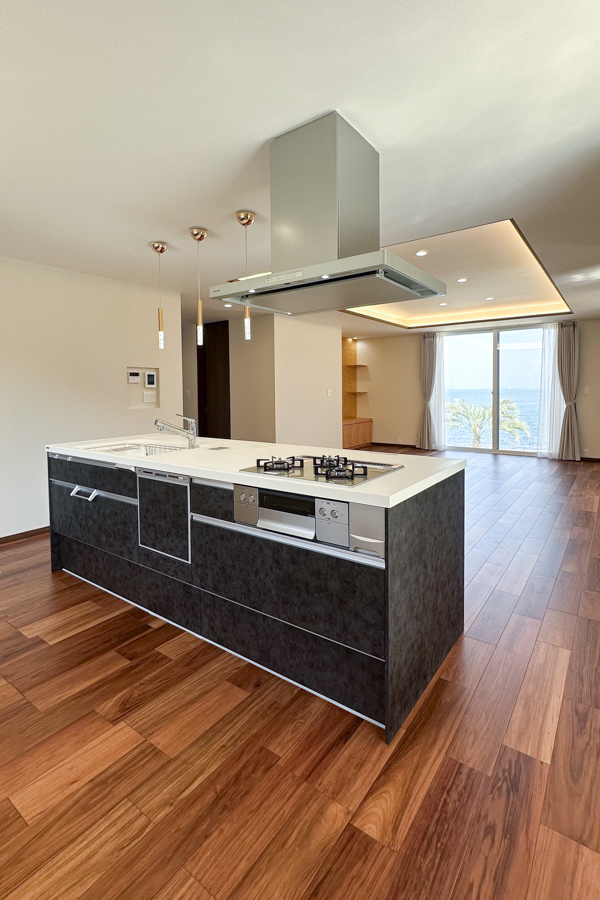 そして窓外に広がる海景までが一直線に繋がる大空間です。