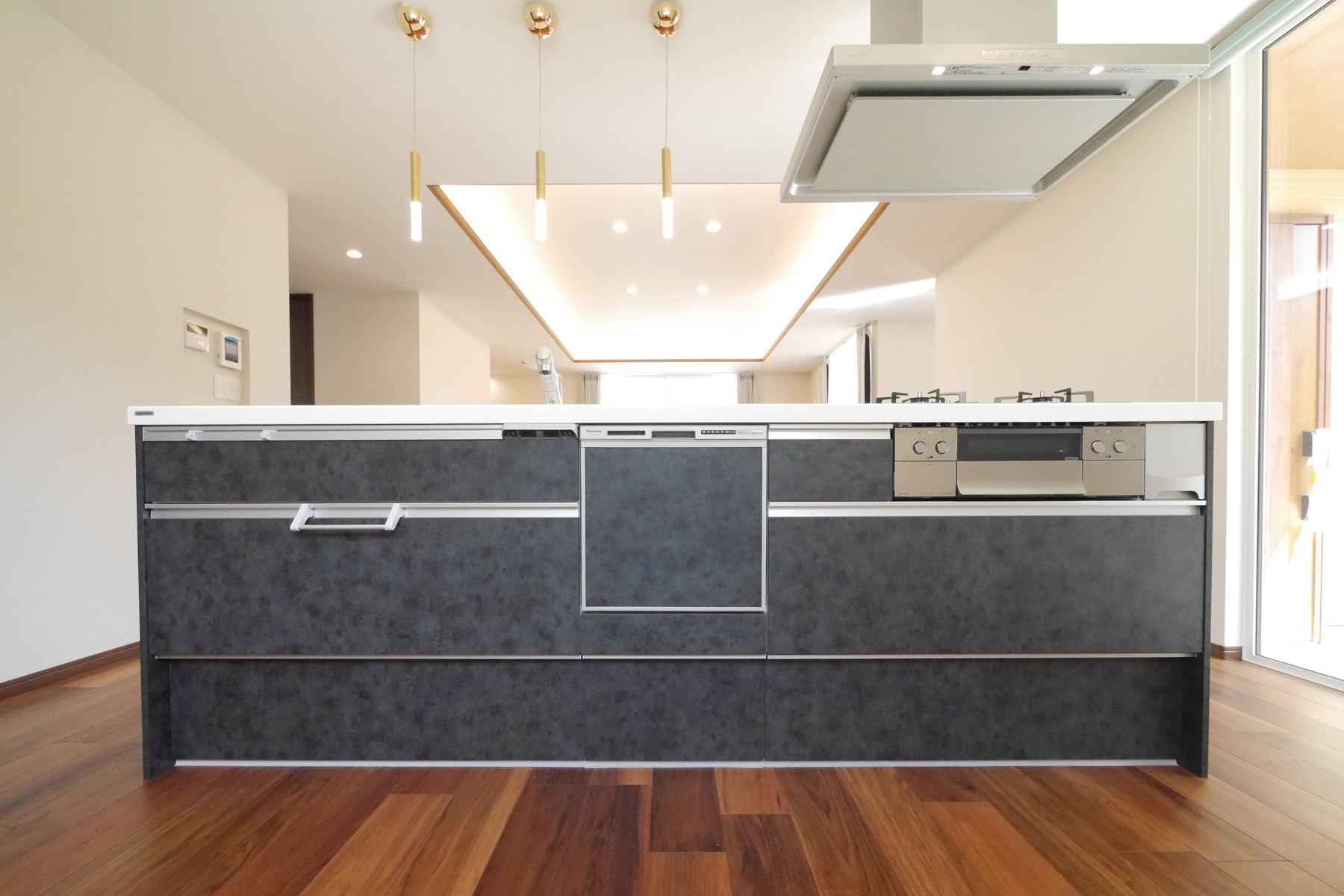 重厚なアイランドスタイルが開放感を生むキッチンから、折上げ天井のリビング、