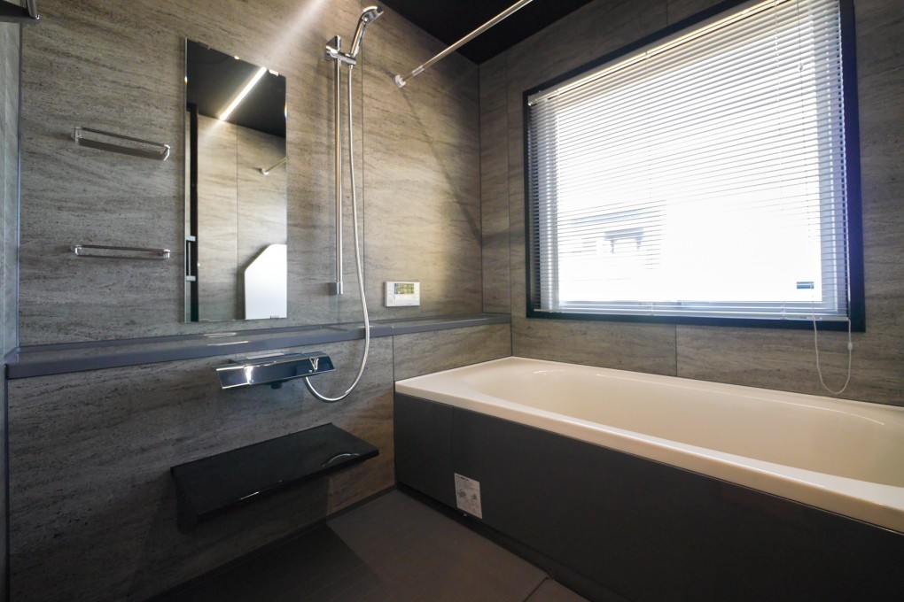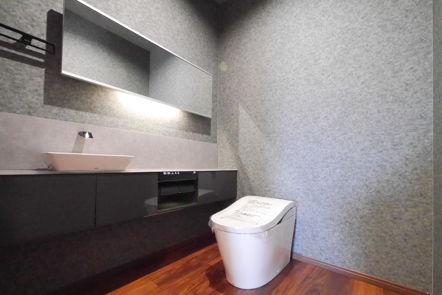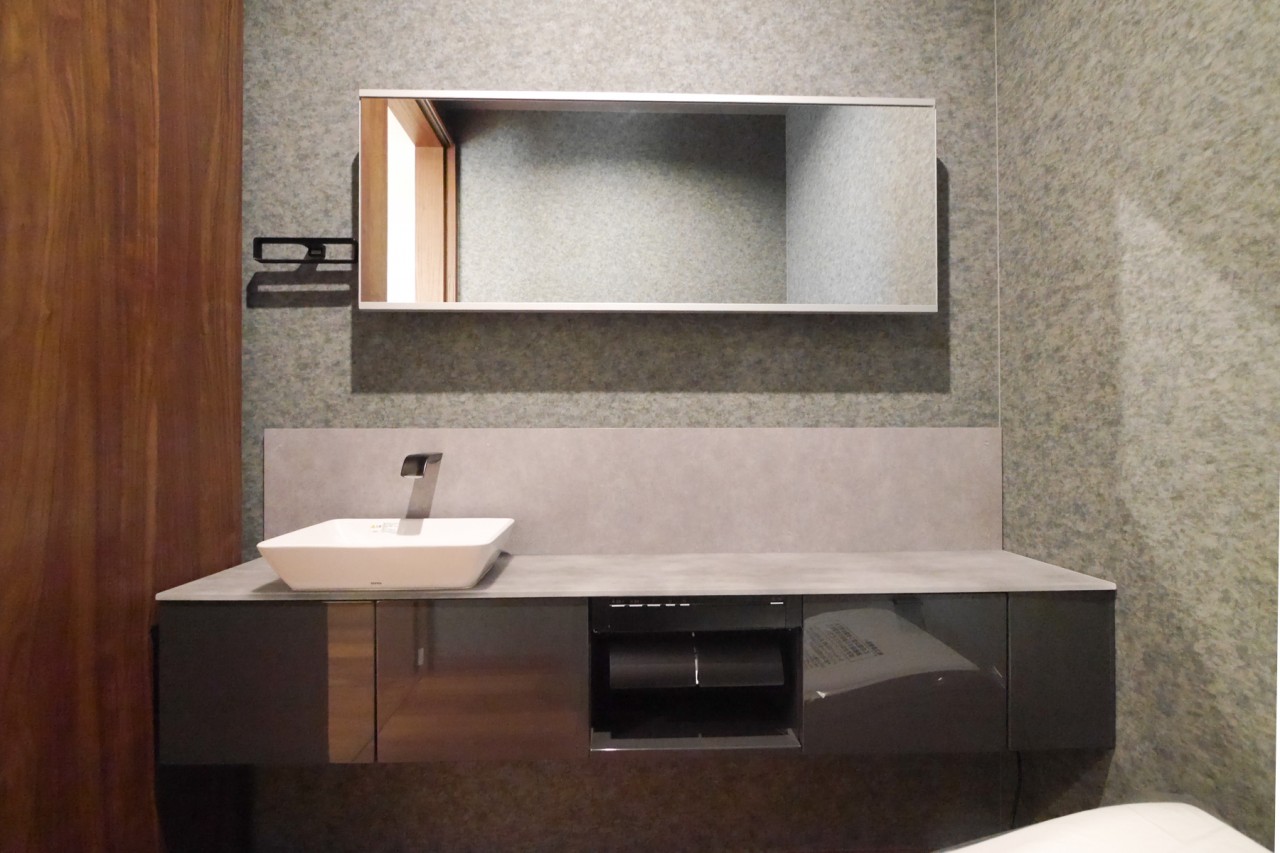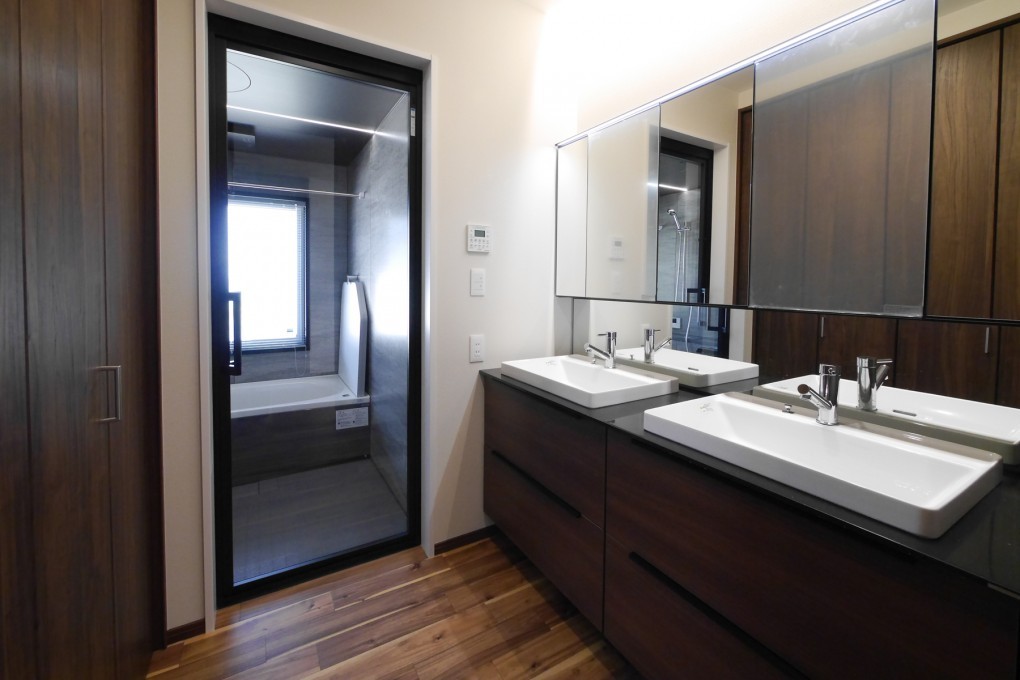 間接照明付きの大型ミラーが空間をより広く見せ、