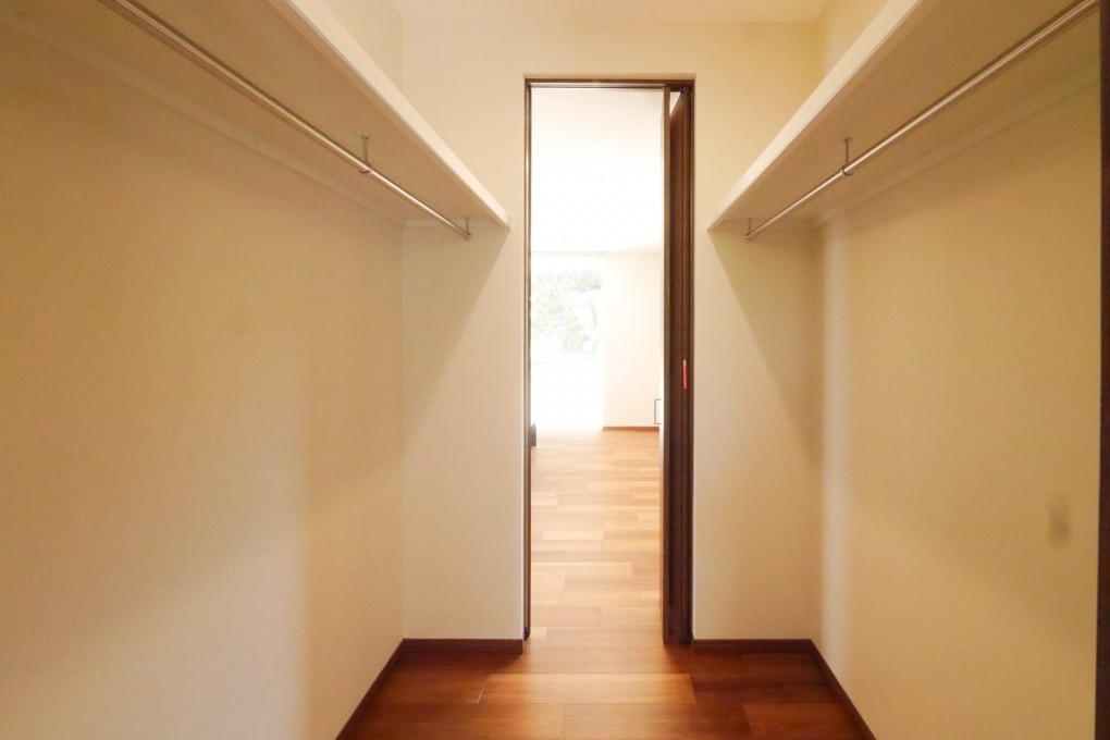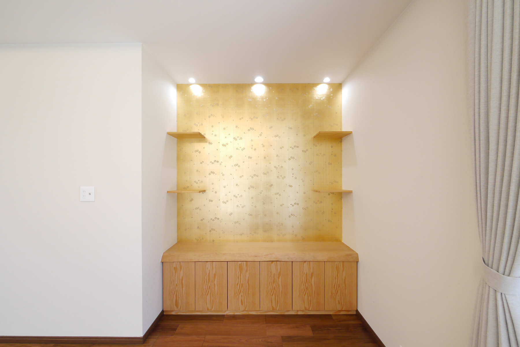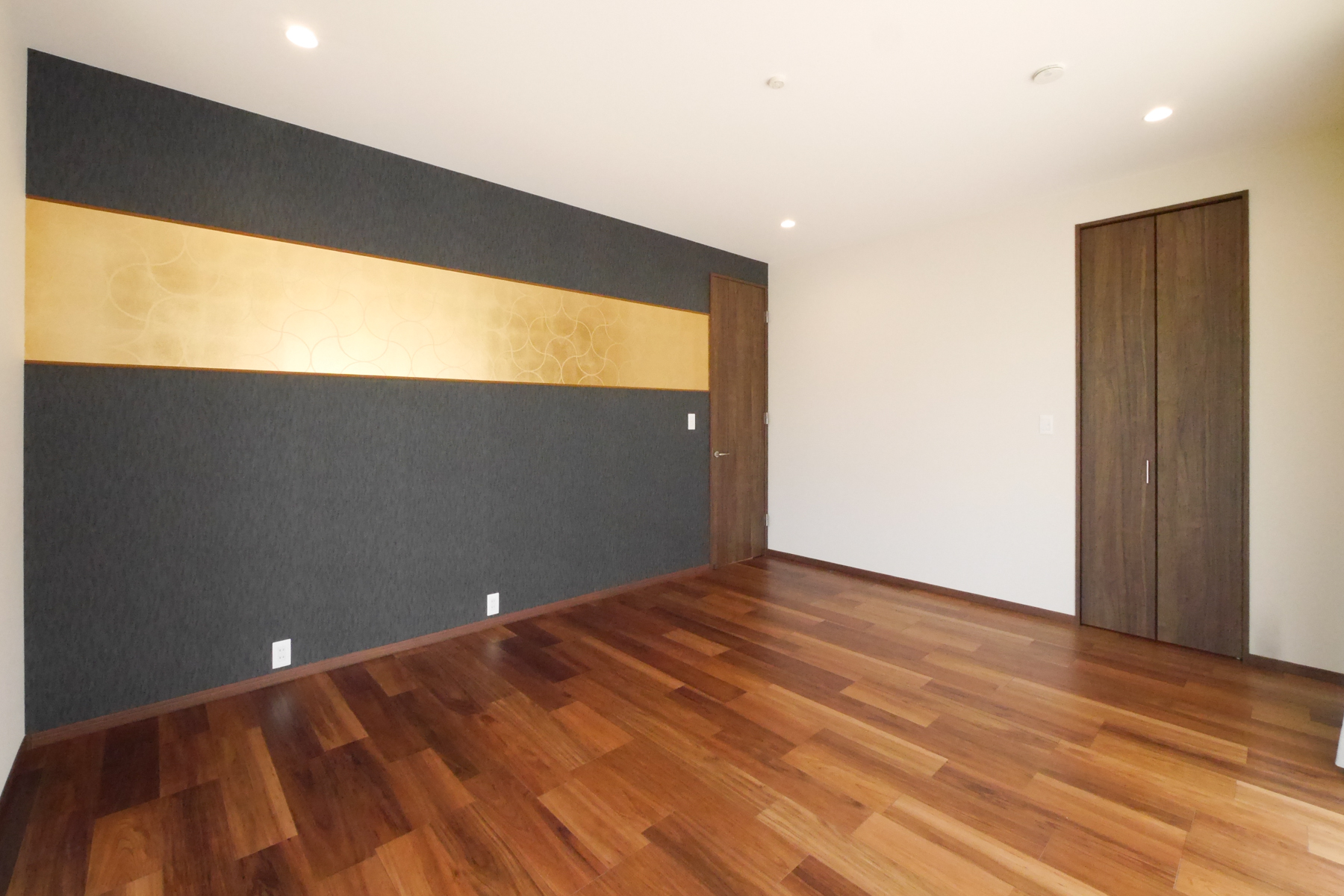 間接照明付きの大型ミラーが空間をより広く見せ、